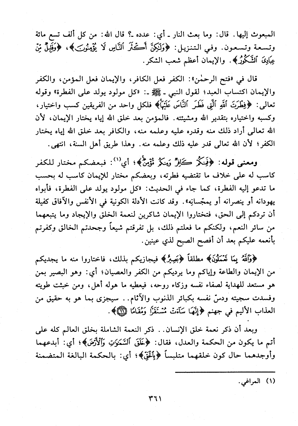 المبعوث إليها. قال: وما بعث النار - أي: عدده -؟ قال الله: من كل ألف تسع مائة وتسعة وتسعون. وفي التنزيل: {وَلَكِنَّ أَكْثَرَ النَّاسِ لَا يُؤْمِنُونَ}، {وَقَلِيلٌ مِنْ عِبَادِيَ الشَّكُورُ}. والإيمان أعظم شعب الشكر.