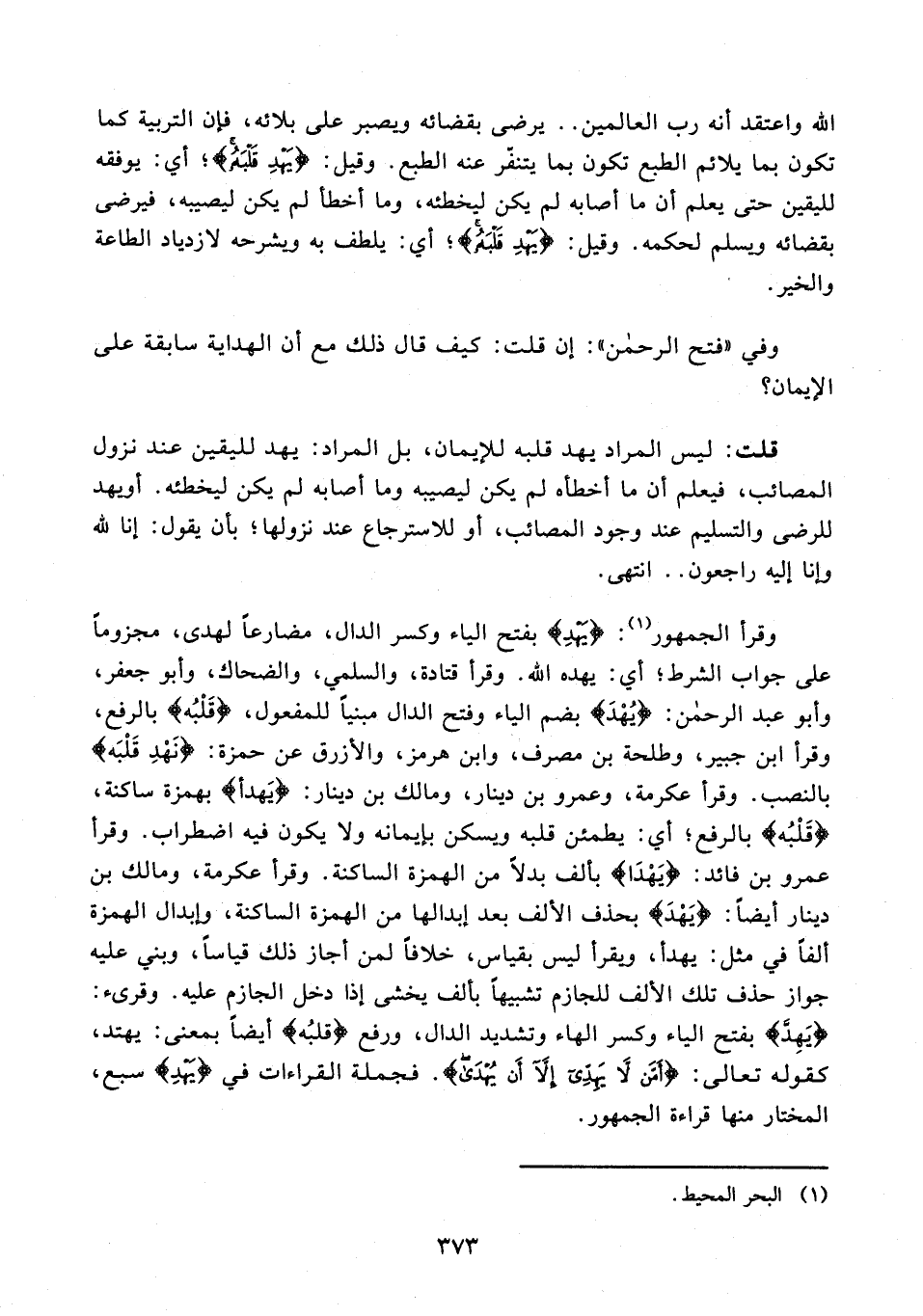 وقرأ الجمهور (¬1): {يَهْدِ} بفتح الياء وكسر الدال، مضارعًا لهدى، مجزومًا على جواب الشرط؛ أي: يهده الله. وقرأ قتادة، والسلمي، والضحاك، وأبو جعفر، وأبو عبد الرحمن: {يُهْدَ} بضم الياء وفتح الدال مبنيًا للمفعول، {قَلْبُه} بالرفع، وقرأ ابن جبير، وطلحة بن مصرف، وابن هرمز، والأزرق عن حمزة: {نَهْدِ قَلْبَه} بالنصب. وقرأ عكرمة، وعمرو بن دينار، ومالك بن دينار: {يَهدأ} بهمزة ساكنة، {قَلْبُه} بالرفع؛ أي: يطمئن قلبه ويسكن بإيمانه ولا يكون فيه اضطراب. وقرأ عمرو بن فائد: {يَهْدَا} بألف بدلًا من الهمزة الساكنة. وقرأ عكرمة، ومالك بن دينار أيضًا: {يَهْدَ} بحذف الألف بعد إبدالها من الهمزة الساكنة، وإبدال الهمزة ألفًا في مثل: يهدأ، ويقرأ ليس بقياس، خلافًا لمن أجاز ذلك قياسًا، وبني عليه جواز حذف تلك الألف للجازم تشبيهًا بألف يخشى إذا دخل الجازم عليه. وقرىء: {يَهِدَّ} بفتح الياء وكسر الهاء وتشديد الدال، ورفع {قلبُه} أيضًا بمعنى: يهتد، كقوله تعالى: {أَمَّنْ لَا يَهِدِّي إِلَّا أَنْ يُهْدَى}. فجملة القراءات في {يَهْدِ} سبع، المختار منها قراءة الجمهور.
