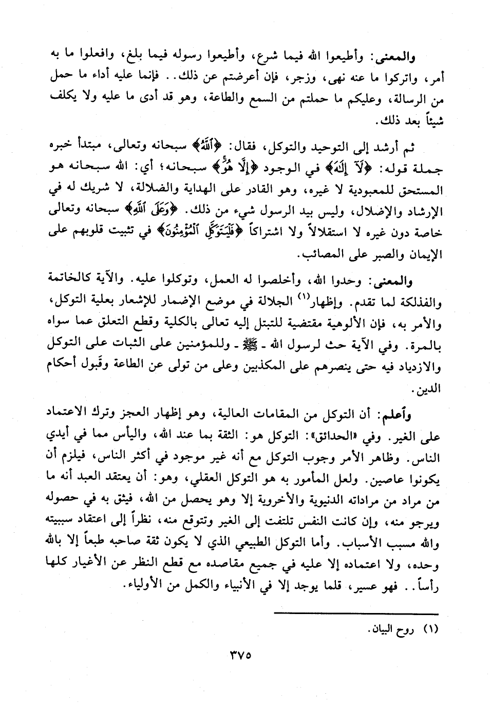 واعلم: أن التوكل من المقامات العالية، وهو إظهار العجز وترك الاعتماد على الغير. وفي "الحدائق": التوكل هو: الثقة بما عند الله، واليأس مما في أيدي الناس. وظاهر الأمر وجوب التوكل مع أنه غير موجود في أكثر الناس، فيلزم أن يكونوا عاصين. ولعل المأمور به هو التوكل العقلي، وهو: أن يعتقد العبد أنه ما من مراد من مراداته الدنيوية والأخروية إلا وهو يحصل من الله، فيثق به في حصوله ويرجو منه، وإن كانت النفس تلتفت إلى الغير وتتوقع منه، نظرًا إلى اعتقاد سببيته والله مسبب الأسباب. وأما التوكل الطبيعي الذي لا يكون ثقة صاحبه طبعًا إلا بالله وحده، ولا اعتماده إلا عليه في جميع مقاصده مع قطع النظر عن الأغيار كلها رأسًا .. فهو عسير، قلما يوجد إلا في الأنبياء والكمل من الأولياء.