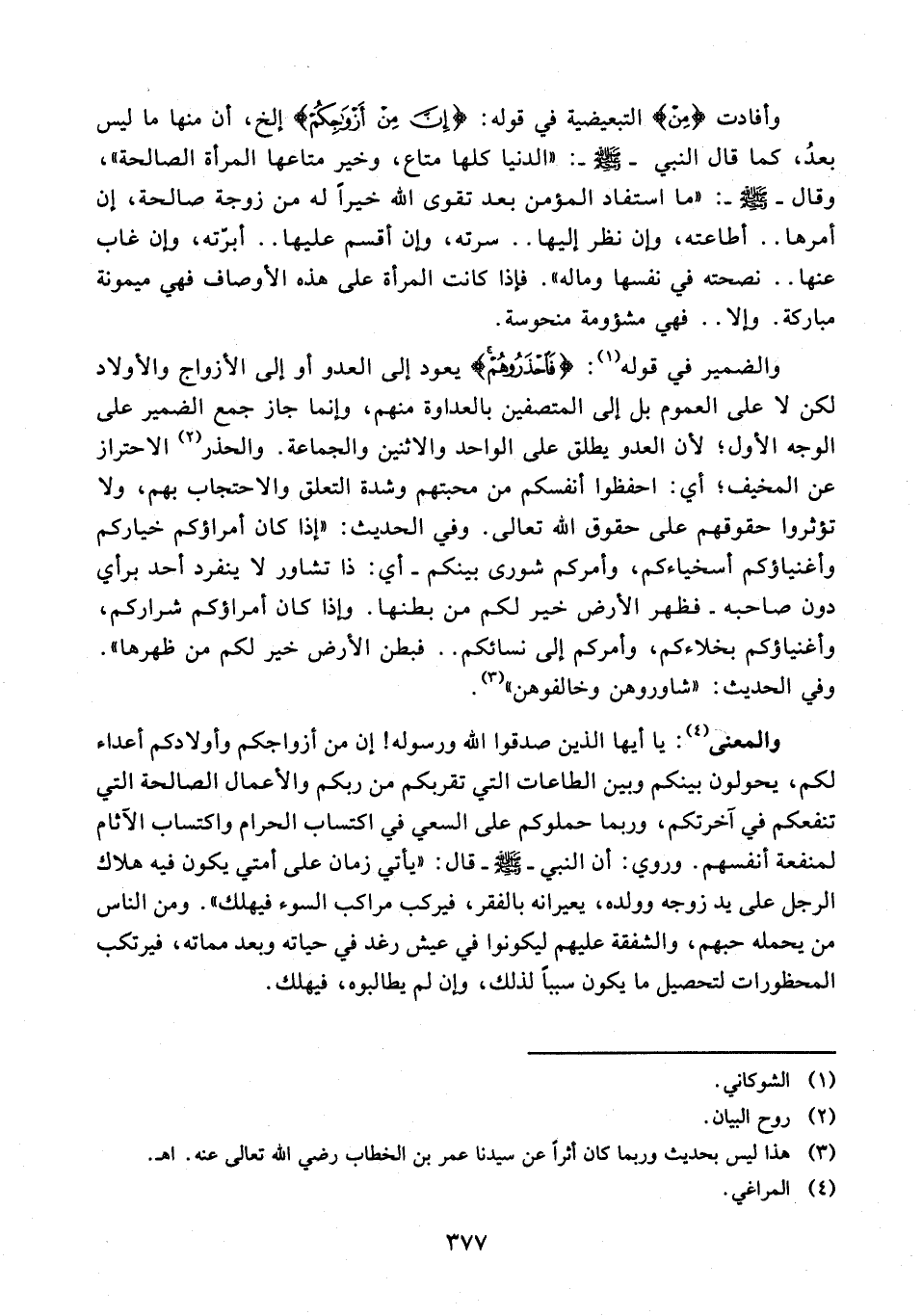 وأفادت {مِنْ} التبعيضية في قوله: {إِنَّ مِنْ أَزْوَاجِكُمْ} إلخ، أن منها ما ليس بعدُ، كما قال النبي - صلى الله عليه وسلم -: "الدنيا كلها متاع، وخير متاعها المرأة الصالحة"، وقال - صلى الله عليه وسلم -: "ما استفاد المؤمن بعد تقوى الله خيرًا له من زوجة صالحة، إن أمرها .. أطاعته، وإن نظر إليها .. سرته، وإن أقسم عليها .. أبرّته، وإن غاب عنها .. نصحته في نفسها وماله". فإذا كانت المرأة على هذه الأوصاف فهي ميمونة مباركة. وإلا .. فهي مشؤومة منحوسة.