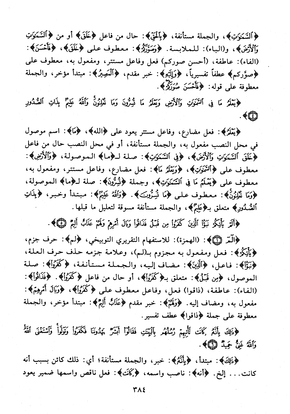 {يَعْلَمُ}: فعل مضارع، وفاعل مستتر يعود على {الله}، {مَا}: اسم موصول في محل النصب مفعول به، والجملة مستأنفة، أو في محل النصب حال من فاعل {خَلَقَ السَّمَاوَاتِ وَالْأَرْضَ}، {فِي السَّمَاوَاتِ}: صلة لـ {ما} الموصولة، {والأرض}: معطوف على {السَّمَاوَاتِ}، {وَيَعْلَمُ مَا}: فعل مضارع، وفاعل مستتر، ومفعول به، معطوف على {يَعْلَمُ مَا فِي السَّمَاوَاتِ}، وجملة {تُسِرُّونَ}: صلة لـ {ما} الموصولة، {وَمَا تُعْلِنُونَ}: معطوف على {مَا تُسِرُّونَ}. {وَاللَّهُ عَلِيمٌ}: مبتدأ وخبر، {بِذَاتِ الصُّدُورِ} متعلق بـ {عَلِيم} والجملة مستأنفة مسوقة لتعليل ما قبلها.