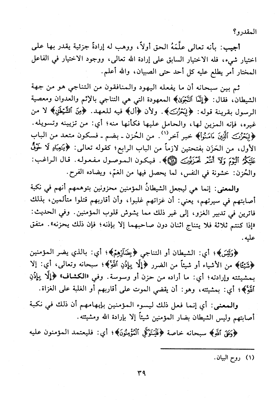 والمعنى: إنما هي ليجعل الشيطانُ المؤمنين محزونين بتوهمهم أنهم في نكبة أصابتهم في سيرتهم، يعني: أن غزاتهم غلبوا، وأن أقاربهم قتلوا متألمين، بذلك فاترين في تدبير الغزو، إلى غير ذلك مما يشوش قلوب المؤمنين. وفي الحديث: "إذا كنتم ثلاثة فلا يتناج اثنان دون صاحبهما إلا بإذنه؛ فإن ذلك يحزنه". متفق عليه.