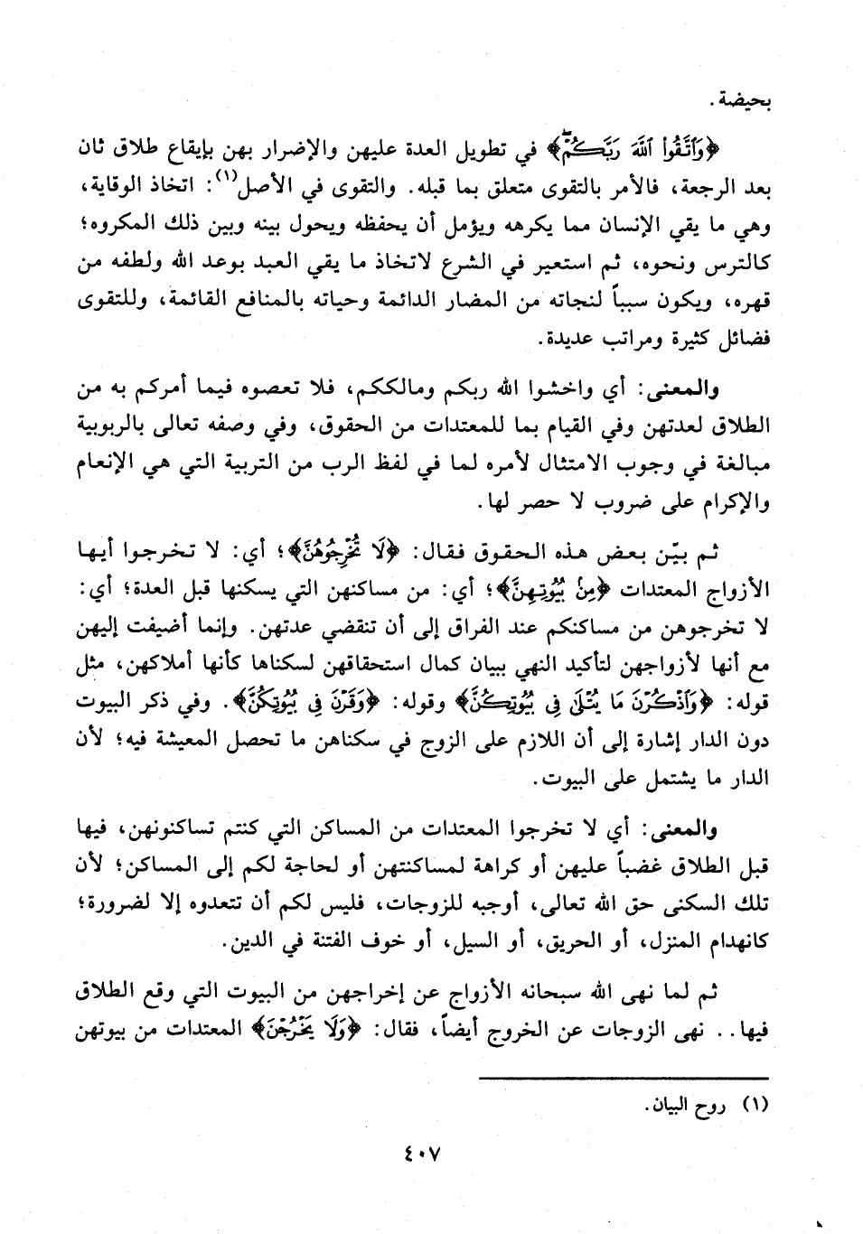 ثم بيّن بعض هذه الحقوق فقال: {لَا تُخْرِجُوهُنَّ}؛ أي: لا تخرجوا أيها الأزواج المعتدات {مِنْ بُيُوتِهِنَّ}؛ أي: من مساكنهن التي يسكنها قبل العدة؛ أي: لا تخرجوهن من مساكنكم عند الفراق إلى أن تنقضي عدتهن. وإنما أضيفت إليهن مع أنها لأزواجهن لتأكيد النهي ببيان كمال استحقاقهن لسكناها كأنها أملاكهن، مثل قوله: {وَاذْكُرْنَ مَا يُتْلَى فِي بُيُوتِكُنَّ} وقوله: {وَقَرْنَ فِي بُيُوتِكُنَّ}. وفي ذكر البيوت دون الدار إشارة إلى أن اللازم على الزوج في سكناهن ما تحصل المعيشة فيه؛ لأن الدار ما يشتمل على البيوت.
