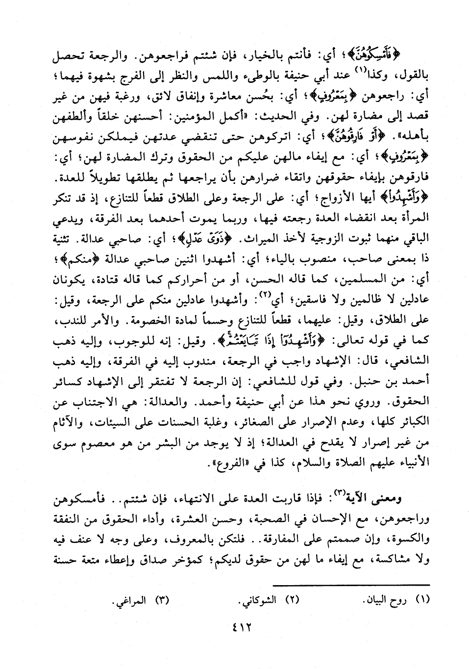 ومعنى الآية (¬3): فإذا قاربت العدة على الانتهاء، فإن شئتم .. فأمسكوهن وراجعوهن، مع الإحسان في الصحبة، وحسن العشرة، وأداء الحقوق من النفقة والكسوة، وإن صممتم على المفارقة .. فلتكن بالمعروف، وعلى وجه لا عنف فيه ولا مشاكسة، مع إيفاء ما لهن من حقوق لديكم؛ كمؤخر صداق وإعطاء متعة حسنة