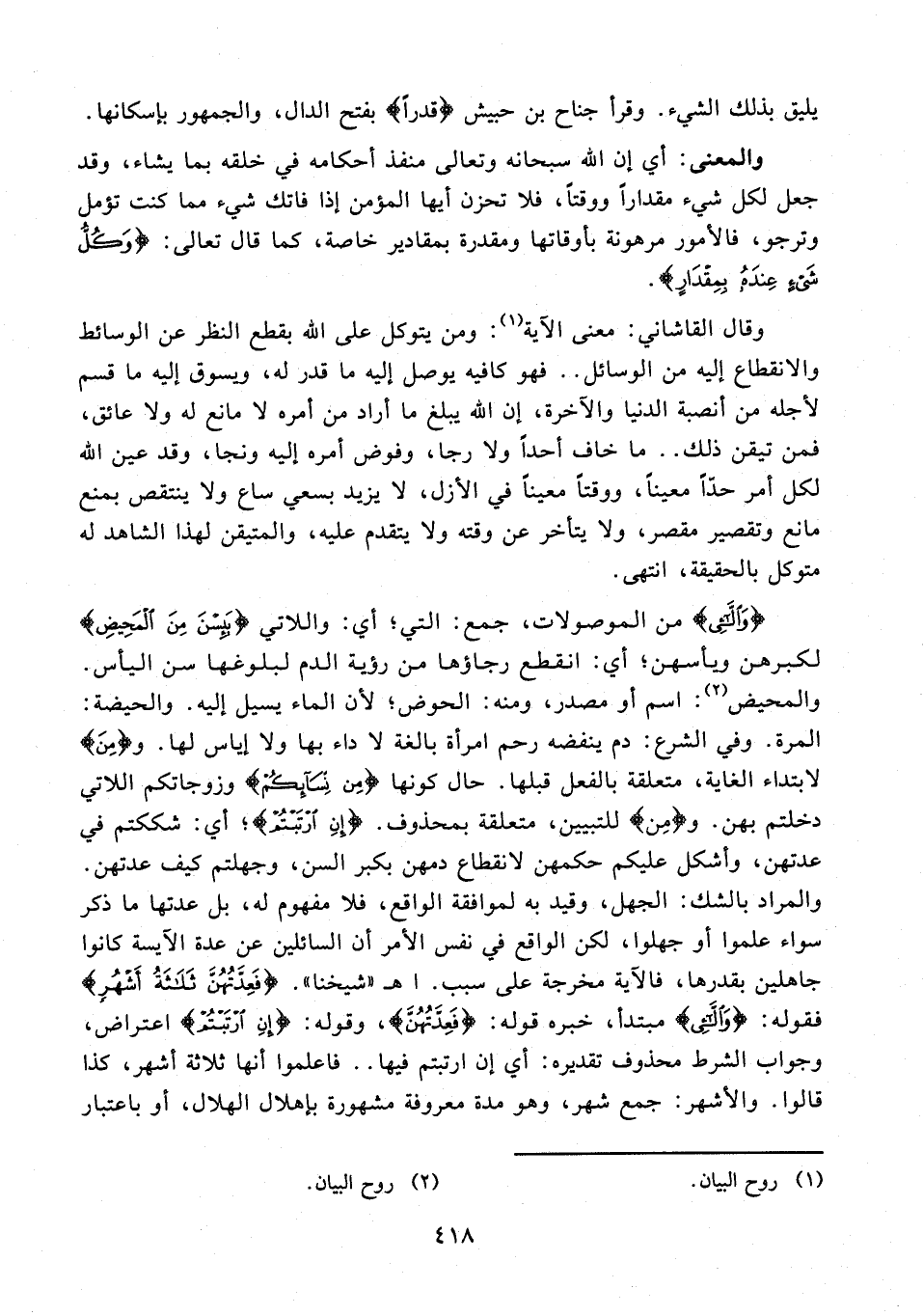 وقال القاشاني: معنى الآية (¬1): ومن يتوكل على الله بقطع النظر عن الوسائط والانقطاع إليه من الوسائل .. فهو كافيه يوصل إليه ما قدر له، وشوق إليه ما قسم لأجله من أنصبة الدنيا والآخرة، إن الله يبلغ ما أراد من أمره لا مانع له ولا عائق، فمن تيقن ذلك .. ما خاف أحدًا ولا رجا، وفوض أمره إليه ونجا، وقد عين الله لكل أمر حدًّا معينًا، ووقتًا معينًا في الأزل، لا يزيد بسعي ساع ولا ينتقص بمنع مانع وتقصير مقصر، ولا يتأخر عن وقته ولا يتقدم عليه، والمتيقن لهذا الشاهد له متوكل بالحقيقة، انتهى.