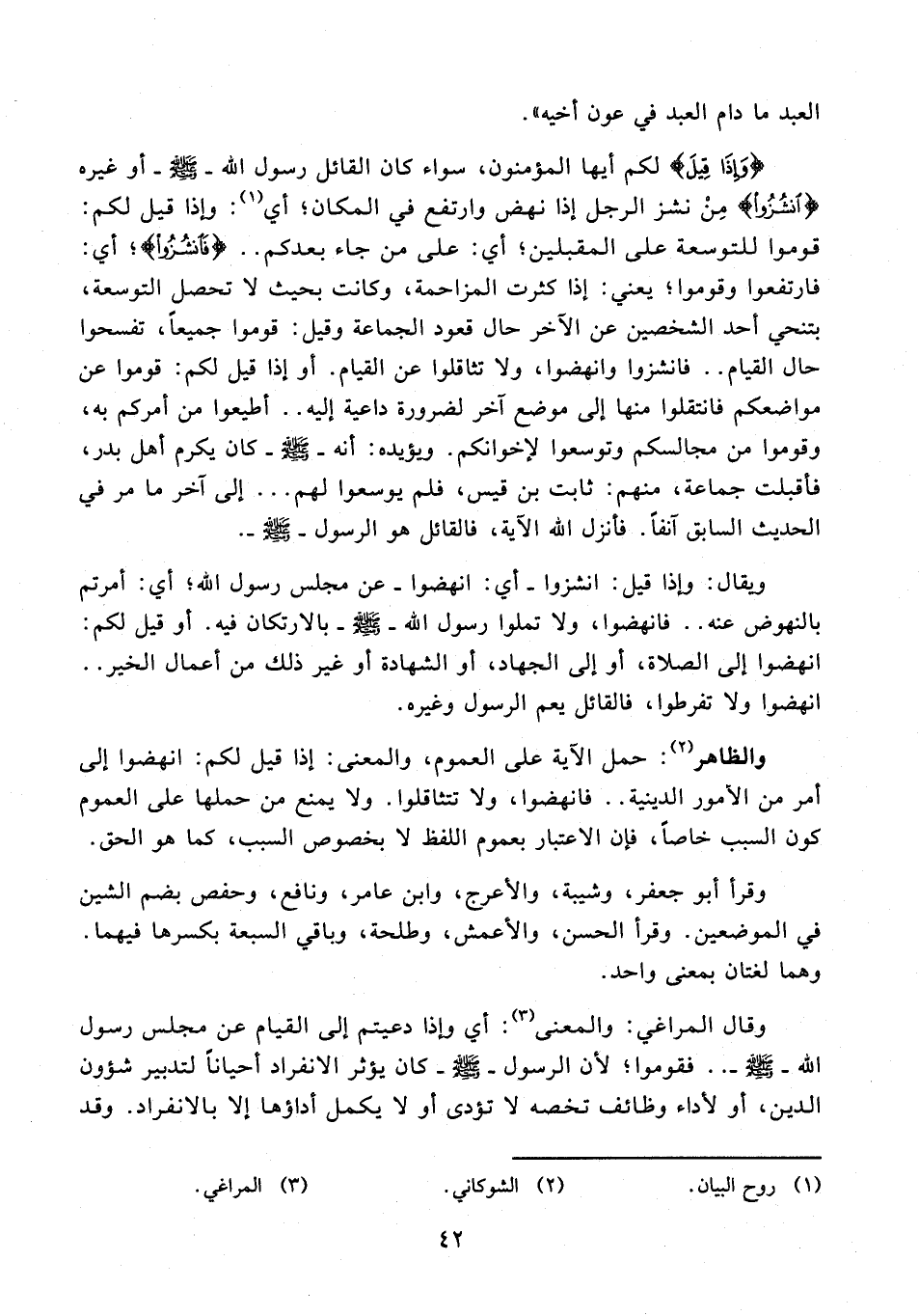 وقال المراغي: والمعنى (¬3): أي وإذا دعيتم إلى القيام عن مجلس رسول الله - صلى الله عليه وسلم - .. فقوموا؛ لأن الرسول - صلى الله عليه وسلم - كان يؤثر الانفراد أحيانًا لتدبير شؤون الدين، أو لأداء وظائف تخصه لا تؤدى أو لا يكمل أداؤها إلا بالانفراد. وقد