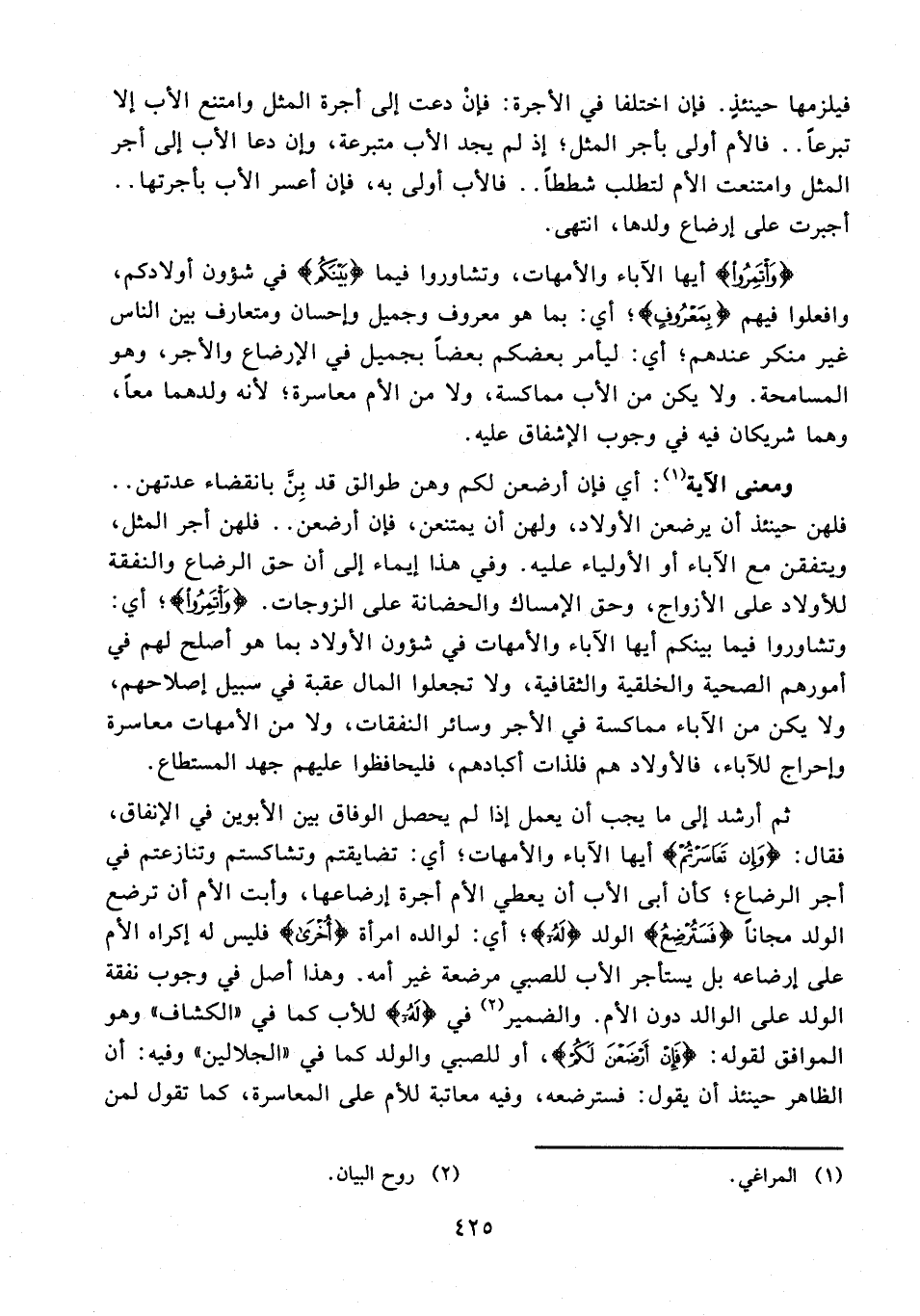ومعنى الآية (¬1): أي فإن أرضعن لكم وهن طوالق قد بِنَّ بانقضاء عدتهن .. فلهن حينئذ أن يرضعن الأولاد، ولهن أن يمتنعن، فإن أرضعن .. فلهن أجر المثل، ويتفقن مع الآباء أو الأولياء عليه. وفي هذا إيماء إلى أن حق الرضاع والنفقة للأولاد على الأزواج، وحق الإمساك والحضانة على الزوجات. {وَأْتَمِرُوا}؛ أي: وتشاوروا فيما بينكم أيها الآباء والأمهات في شؤون الأولاد بما هو أصلح لهم في أمورهم الصحية والخلقية والثقافية، ولا تجعلوا المال عقبة في سبيل إصلاحهم، ولا يكن من الآباء مماكسة في الأجر وسائر النفقات، ولا من الأمهات معاسرة وإحراج للآباء، فالأولاد هم فلذات أكبادهم، فليحافظوا عليهم جهد المستطاع.