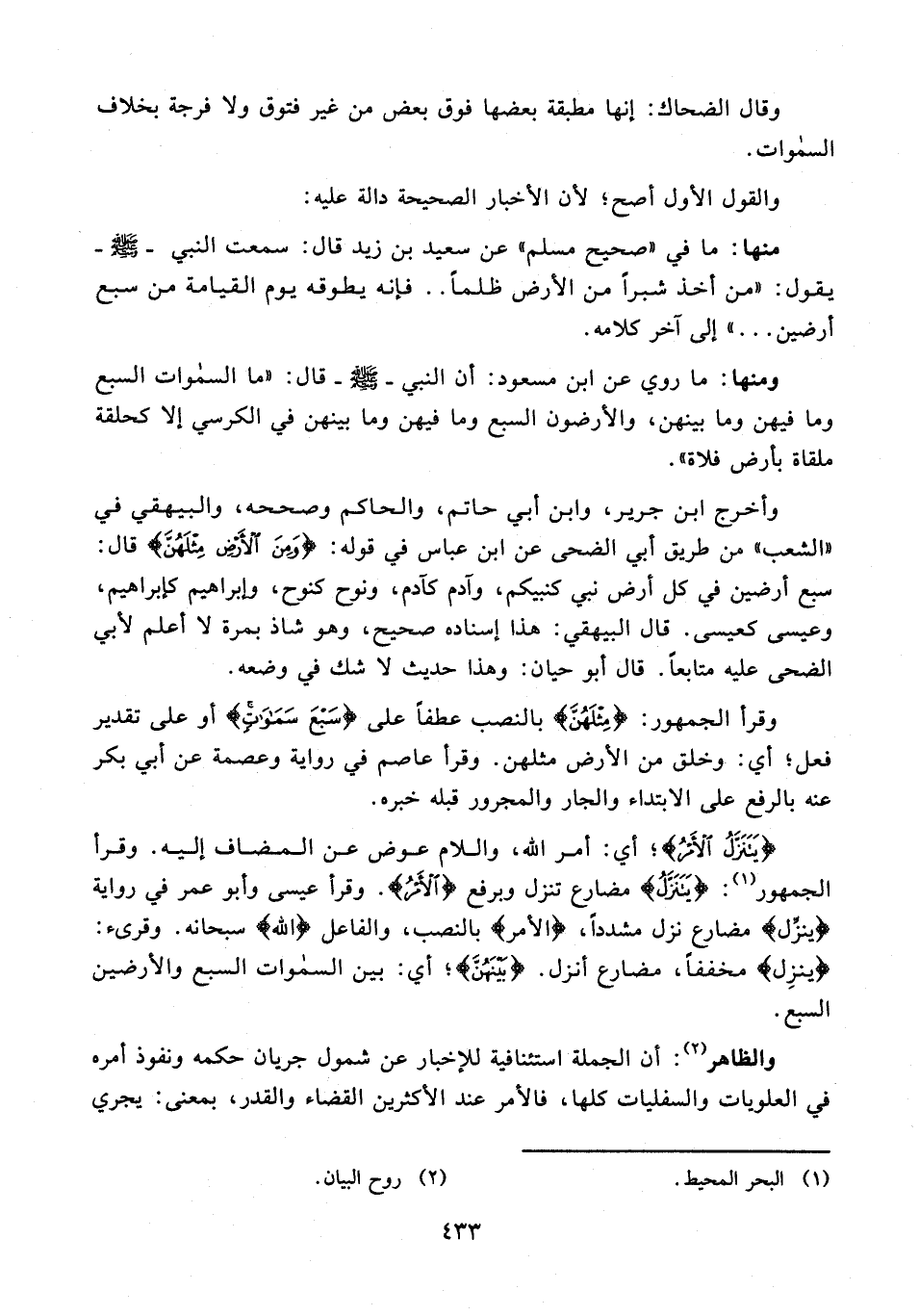 وأخرج ابن جرير، وابن أبي حاتم، والحاكم وصححه، والبيهقي في "الشعب" من طريق أبى الضحى عن ابن عباس في قوله: {وَمِنَ الْأَرْضِ مِثْلَهُنَّ} قال: سبع أرضين في كل أرض نبي كنبيكم، وآدم كآدم، ونوح كنوح، وإبراهيم كإبراهيم، وعيسى كعيسى. قال البيهقي: هذا إسناده صحيح، وهو شاذ بمرة لا أعلم لأبي الضحى عليه متابعًا. قال أبو حيان: وهذا حديث لا شك في وضعه.