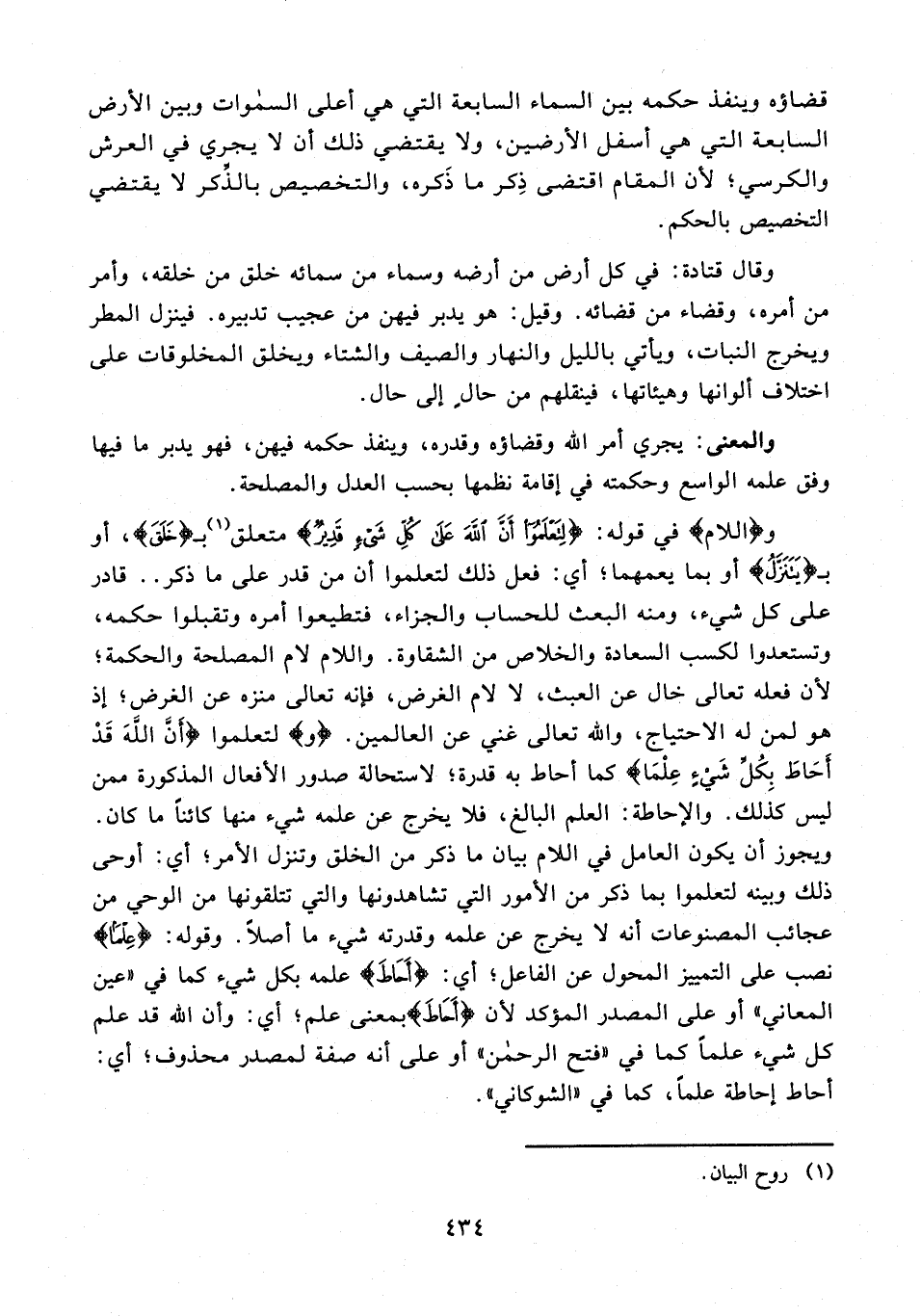 و {اللام} في قوله: {لِتَعْلَمُوا أَنَّ اللَّهَ عَلَى كُلِّ شَيْءٍ قَدِيرٌ} متعلق (¬1) بـ {خَلَقَ}، أو بـ {يَتَنَزَّلُ} أو بما يعمهما؛ أي: فعل ذلك لتعلموا أن من قدر على ما ذكر .. قادر على كل شيء، ومنه البعث للحساب والجزاء، فتطيعوا أمره وتقبلوا حكمه، وتستعدوا لكسب السعادة والخلاص من الشقاوة. واللام لام المصلحة والحكمة؛ لأن فعله تعالى نجال عن العبث، لا لام الغرض، فإنه تعالى منزه عن الغرض؛ إذ هو لمن له الاحتياج، والله تعالى غني عن العالمين. {و} لتعلموا {أَنَّ اللَّهَ قَدْ أَحَاطَ بِكُلِّ شَيْءٍ عِلْمًا} كما أحاط به قدرة؛ لاستحالة صدور الأفعال المذكورة ممن ليس كذلك. والإحاطة: العلم البالغ، فلا يخرج عن علمه شيء منها كائنًا ما كان. ويجوز أن يكون العامل في اللام بيان ما ذكر من الخلق وتنزل الأمر؛ أي: أوحى ذلك وبينه لتعلموا بما ذكر من الأمور التي تشاهدونها والتي تتلقونها من الوحي من عجائب المصنوعات أنه لا يخرج عن علمه وقدرته شيء ما أصلًا. وقوله: {عِلْمًا} نصب على التمييز المحول عن الفاعل؛ أي: {أَحَاطَ} علمه بكل شيء كما في "عين المعاني أو على المصدر المؤكد لأن {أَحَاطَ} بمعنى علم؛ أي: وأن الله قد علم كل شيء علمًا، كما في "فتح الرحمن" أو على أنه صفة لمصدر محذوف؛ أي: أحاط إحاطة علمًا، كما في "الشوكاني".