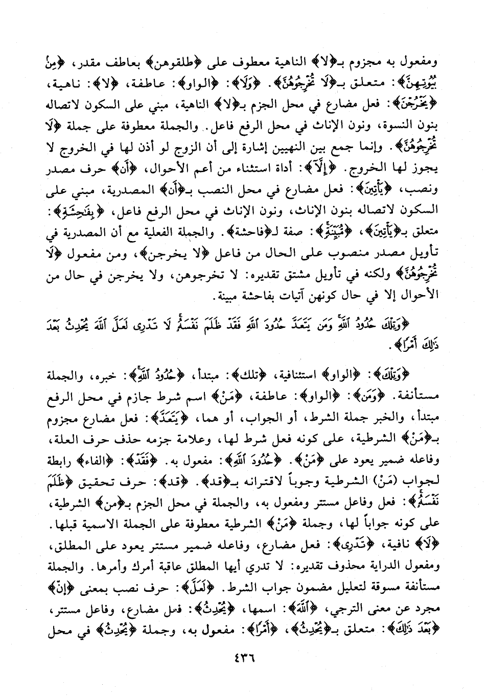 ومفعول به مجزوم بـ {لا} الناهية معطوف على {طلقوهن} بعاطف مقدر، {مِنْ بُيُوتِهِنَّ}: متعلق بـ {لَا تُخْرِجُوهُنَّ}. {وَلَا}: {الواو}: عاطفة، {لا}: ناهية، {يَخْرُجْنَ}: فعل مضارع في محل الجزم بـ {لا} الناهية، مبني على السكون لاتصاله بنون النسوة، ونون الإناث في محل الرفع فاعل. والجملة معطوفة على جملة {لَا تُخْرِجُوهُنَّ}. وإنما جمع بين النهيين إشارة إلى أن الزوج لو أذن لها في الخروج لا يجوز لها الخروج. {إِلَّا}: أداة استثناء من أعم الأحوال، {أَنْ} حرف مصدر ونصب، {يَأْتِينَ}: فعل مضارع في محل النصب بـ {أن} المصدرية، مبني على السكون لاتصاله بنون الإناث، ونون الإناث في محل الرفع فاعل، {بِفَاحِشَةٍ}: متعلق بـ {يَأْتِينَ} {مُبَيِّنَةٍ}: صفة لـ {فاحشة}، والجملة الفعلية مع أن المصدرية في تأويل مصدر منصوب على الحال من فاعل {لا يخرجن}، ومن مفعول {لَا تُخْرِجُوهُنَّ} ولكنه في تأويل مشتق تقديره: لا تخرجوهن، ولا يخرجن في حال من الأحوال إلا في حال كونهن آتيات بفاحشة مبينة.