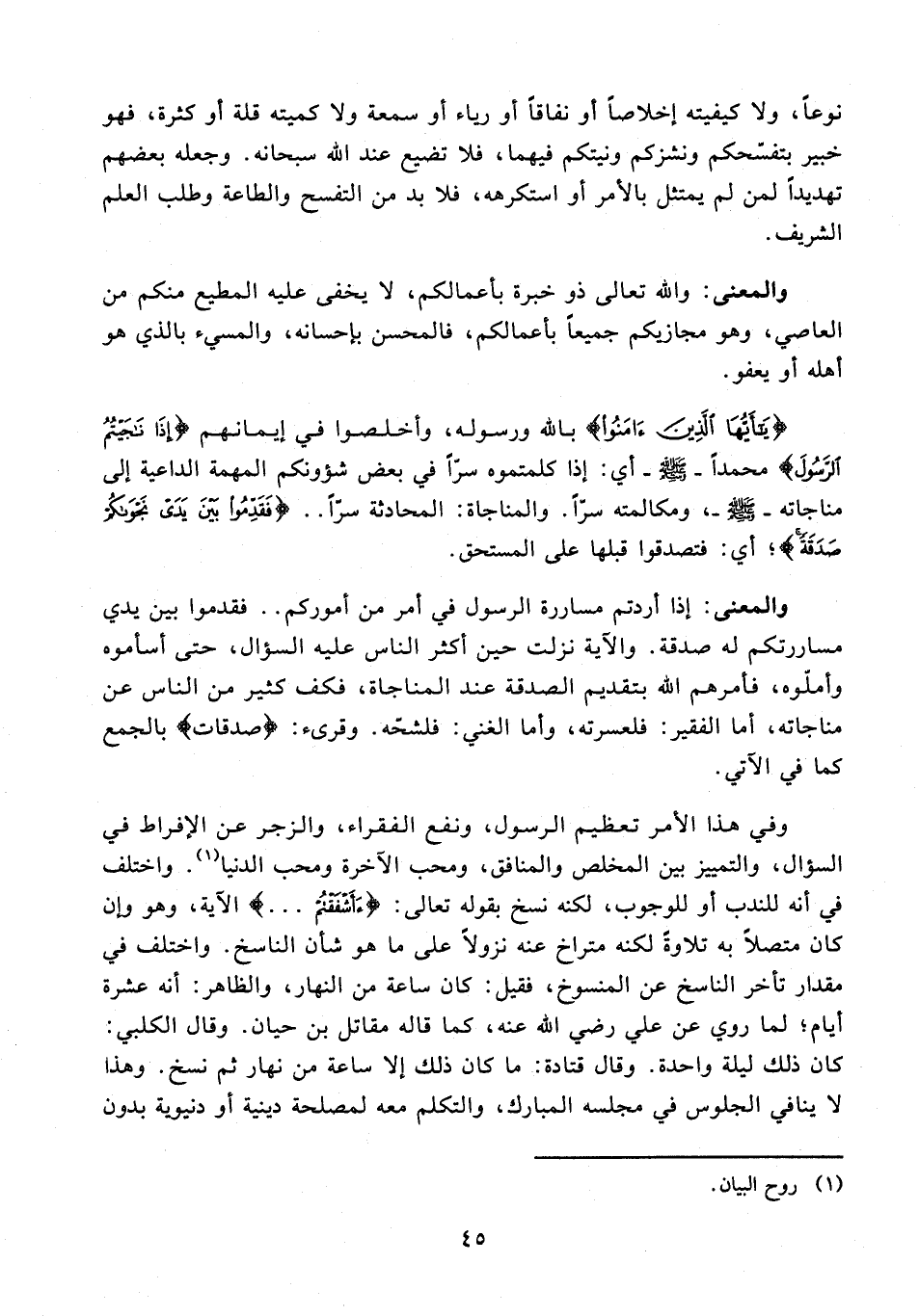 12 - {يَا أَيُّهَا الَّذِينَ آمَنُوا} بالله ورسوله، وأخلصوا في إيمانهم {إِذَا نَاجَيْتُمُ الرَّسُولَ} محمدًا - صلى الله عليه وسلم - أي: إذا كلمتموه سرًّا في بعض شؤونكم المهمة الداعية إلى مناجاته - صلى الله عليه وسلم -، ومكالمته سرًّا. والمناجاة: المحادثة سرًّا .. {فَقَدِّمُوا بَيْنَ يَدَيْ نَجْوَاكُمْ صَدَقَةً}؛ أي: فتصدقوا قبلها على المستحق.