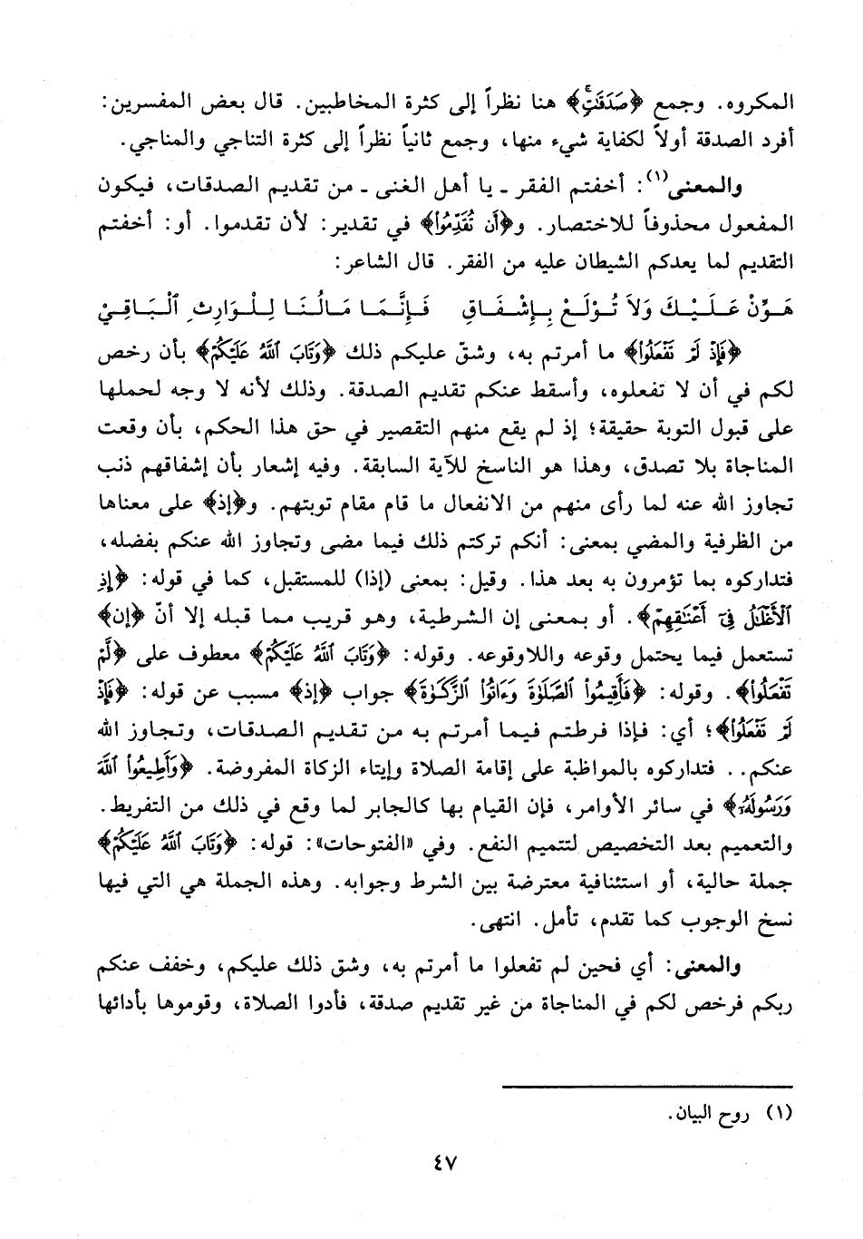 {فَإِذْ لَمْ تَفْعَلُوا} ما أمرتم به، وشقّ عليكم ذلك {وَتَابَ اللَّهُ عَلَيْكُمْ} بأن رخص لكم في أن لا تفعلوه، وأسقط عنكم تقديم الصدقة. وذلك لأنه لا وجه لحملها على قبول التوبة حقيقة؛ إذ لم يقع منهم التقصير في حق هذا الحكم، بأن وقعت المناجاة بلا تصدق، وهذا هو الناسخ للآية السابقة. وفيه إشعار بأن إشفاقهم ذنب تجاوز الله عنه لما رأى منهم من الانفعال ما قام مقام توبتهم. و {إذ} على معناها من الظرفية والمضي بمعنى: أنكم تركتم ذلك فيما مضى وتجاوز الله عنكم بفضله، فتداركوه بما تؤمرون به بعد هذا. وقيل: بمعنى (إذا) للمستقبل، كما في قوله: {إِذِ الْأَغْلَالُ فِي أَعْنَاقِهِمْ}. أو بمعنى إن الشرطية، وهو قريب مما قبله إلا أنّ {إن} تستعمل فيما يحتمل وقوعه واللاوقوعه. وقوله: {وَتَابَ اللَّهُ عَلَيْكُمْ} معطوف على {لَمْ تَفْعَلُوا}. وقوله: {فَأَقِيمُوا الصَّلَاةَ وَآتُوا الزَّكَاةَ} جواب {إذ} مسبب عن قوله: {فَإِذْ لَمْ تَفْعَلُوا}؛ أي: فإذا فرطتم فيما أمرتم به من تقديم الصدقات، وتجاوز الله عنكم .. فتداركوه بالمواظبة على إقامة الصلاة وإيتاء الزكاة المفروضة. {وَأَطِيعُوا اللَّهَ وَرَسُولَهُ}، في سائر الأوامر، فإن القيام بها كالجابر لما وقع في ذلك من التفريط. والتعميم بعد التخصيص لتتميم النفع. وفي "الفتوحات": قوله: {وَتَابَ اللَّهُ عَلَيْكُمْ} جملة حالية، أو استئنافية معترضة بين الشرط وجوابه. وهذه الجملة هي التي فيها نسخ الوجوب كما تقدم، تأمل. انتهى.