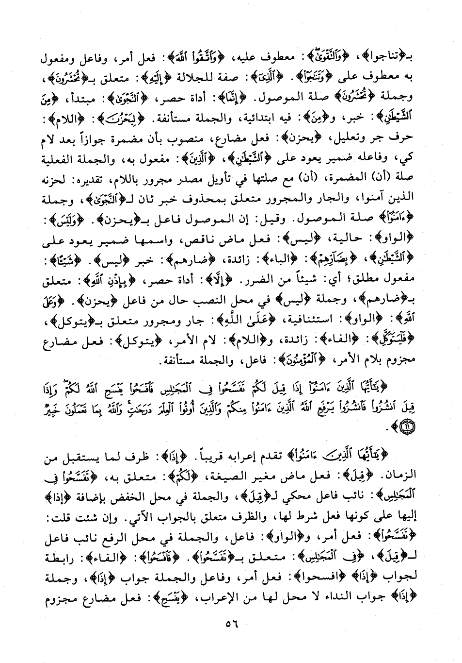بـ {تناجوا}، {وَالتَّقْوَى}: معطوف عليه، {وَاتَّقُوا اللَّهَ}: فعل أمر، وفاعل ومفعول به معطوف على {وَتَنَاجَوْا}. {الَّذِي}: صفة للجلالة {إِلَيْهِ}: متعلق بـ {تُحْشَرُونَ}، وجملة {تُحْشَرُونَ} صلة الموصول. {إِنَّمَا}: أداة حصر {النَّجْوَى}: مبتدأ، {مِنَ الشَّيْطَانِ}: خبر، و {مِنَ}: فيه ابتدائية، والجملة مستأنفة. {لِيَحْزُنَ}: {اللام}: حرف جر وتعليل، {يحزن}: فعل مضارع، منصوب بأن مضمرة جوازًا بعد لام كي، وفاعله ضمير يعود على {الشَّيْطَانِ}، {الَّذِينَ}: مفعول به، والجملة الفعلية صلة (أن) المضمرة، (أن) مع صلتها في تأويل مصدر مجرور باللام، تقديره: لحزنه الذين آمنوا، والجار والمجرور متعلق بمحذوف خبر ثان لـ {النَّجْوَى}، وجملة {آمَنُوا} صلة الموصول. وقيل: إن الموصول فاعل بـ {يحزن}. {وَلَيْسَ}: {الواو}: حالية، {ليس}: فعل ماض ناقص، واسمها ضمير يعود على {الشَّيْطَانِ}، {بِضَارِّهِمْ}: {الباء}: زائدة، {ضارهم}: خبر {ليس}. {شَيْئًا}: مفعول مطلق؛ أي: شيئًا من الضرر. {إِلَّا}: أداة حصر، {بِإِذْنِ اللَّهِ}: متعلق بـ {ضارهم}، وجملة {ليس} في محل النصب حال من فاعل {يحزن}. {وَعَلَى اللَّهِ}: {الواو}: استئنافية، {عَلَى اللَّهِ}: جار ومجرور متعلق بـ {يتوكل}، {فَلْيَتَوَكَّلِ}: {الفاء}: زائدة، و {اللام}: لام الأمر، {يتوكل}: فعل مضارع مجزوم بلام الأمر، {الْمُؤْمِنُونَ}: فاعل، والجملة مستأنفة.
