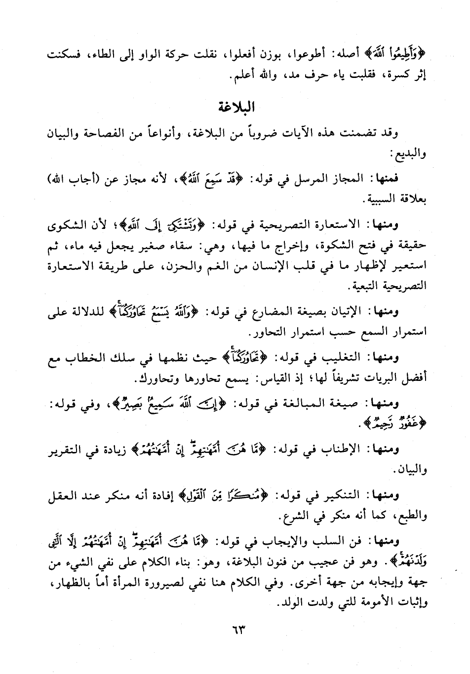 ومنها: الاستعارة التصريحية في قوله: {وَتَشْتَكِي إِلَى اللَّهِ}؛ لأن الشكوى حقيقة في فتح الشكوة، وإخراج ما فيها، وهي: سقاء صغير يجعل فيه ماء، ثم استعير لإظهار ما في قلب الإنسان من الغم والحزن، على طريقة الاستعارة التصريحية التبعية.