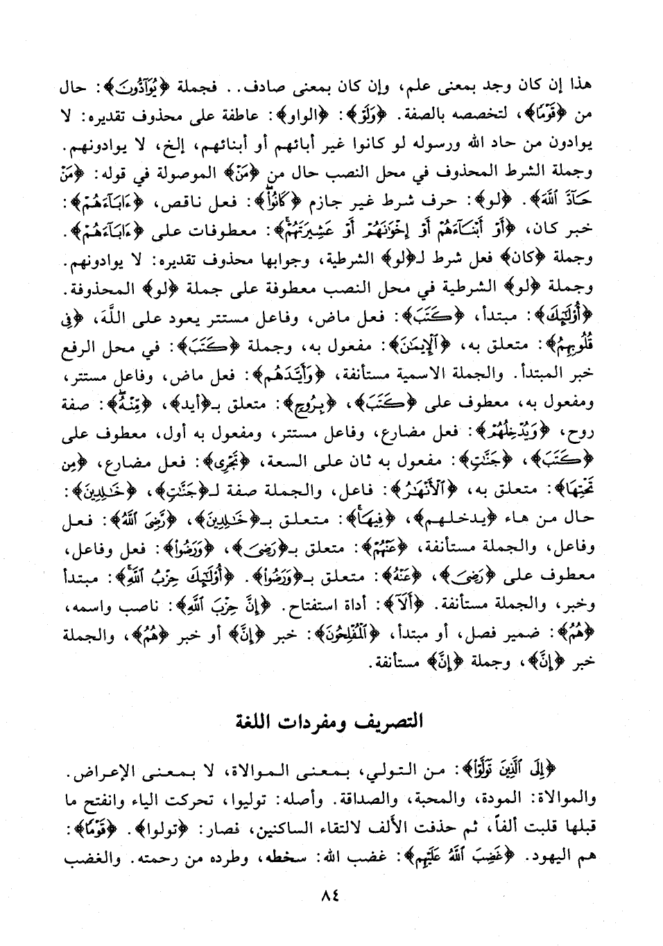 هذا إن كان وجد بمعنى علم، وإن كان بمعنى صادف .. فجملة {يُوَادُّونَ}: حال من {قَوْمًا}، لتخصصه بالصفة. {وَلَوْ}: {الواو}: عاطفة على محذوف تقديره: لا يوادون من حاد الله ورسوله لو كانوا غير أبائهم أو أبنائهم، إلخ، لا يوادونهم. وجملة الشرط المحذوف في محل النصب حال من {مَن} الموصولة في قوله: {مَنْ حَادَّ اللَّهَ}. {لو}: حرف شرط غير جازم {كَانُوا}: فعل ناقص، {آبَاءَهُمْ}: خبر كان، {أَوْ أَبْنَاءَهُمْ أَوْ إِخْوَانَهُمْ أَوْ عَشِيرَتَهُمْ}: معطوفات على {آبَاءَهُمْ}. وجملة {كان} فعل شرط لـ {لو} الشرطية، وجوابها محذوف تقديره: لا يوادونهم. وجملة {لو} الشرطية في محل النصب معطوفة على جملة {لو} المحذوفة. {أُولَئِكَ}: مبتدأ، {كَتَبَ}: فعل ماض، وفاعل مستتر يعود على اللهَ، {فِي قُلُوبِهِمُ}: متعلق به، {الْإِيمَانَ}: مفعول به، وجملة {كَتَبَ}: في محل الرفع خبر المبتدأ. والجملة الاسمية مستأنفة، {وَأَيَّدَهُمْ}: فعل ماضي، وفاعل مستتر، ومفعول به، معطوف على {كَتَبَ}، {بِرُوحٍ}: متعلق بـ {أَيَّدَ}، {مِنْهُ}: صفة روح، {وَيُدْخِلُهُمْ}: فعل مضارع، وفاعل مستتر، ومفعول به أول، معطوف على {كَتَبَ}، {جَنَّاتٍ}: مفعول به ثان على السعة، {تَجْرِي}: فعل مضارع، {مِنْ تَحْتِهَا}: متعلق به، {الْأَنْهَارُ}: فاعل، والجملة صفة لـ {جَنَّاتٍ}، {خَالِدِينَ}: حال من هاء {يدخلهم}، {فِيهَا}: متعلق بـ {خَالِدِينَ}، {رَضِيَ اللَّهُ}: فعل وفاعل، والجملة مستأنفة، {عَنْهُمْ}: متعلق بـ {رَضِىَ}، {وَرَضُوا}: فعل وفاعل، معطوف على {رَضِيَ}، {عَنْهُ}: متعلق بـ {وَرَضُوا}. {أُولَئِكَ حِزْبُ اللَّهِ}: مبتدأ وخبر، والجملة مستأنفة. {أَلَا}: أداة استفتاح. {إِنَّ حِزْبَ اللَّهِ}: ناصب واسمه، {هُمُ}: ضمير فصل، أو مبتدأ، {الْمُفْلِحُونَ}: خبر {إنَّ} أو خبر {هُمُ}، والجملة خبر {إِنَّ}، وجملة {إِنَّ} مستأنفة.