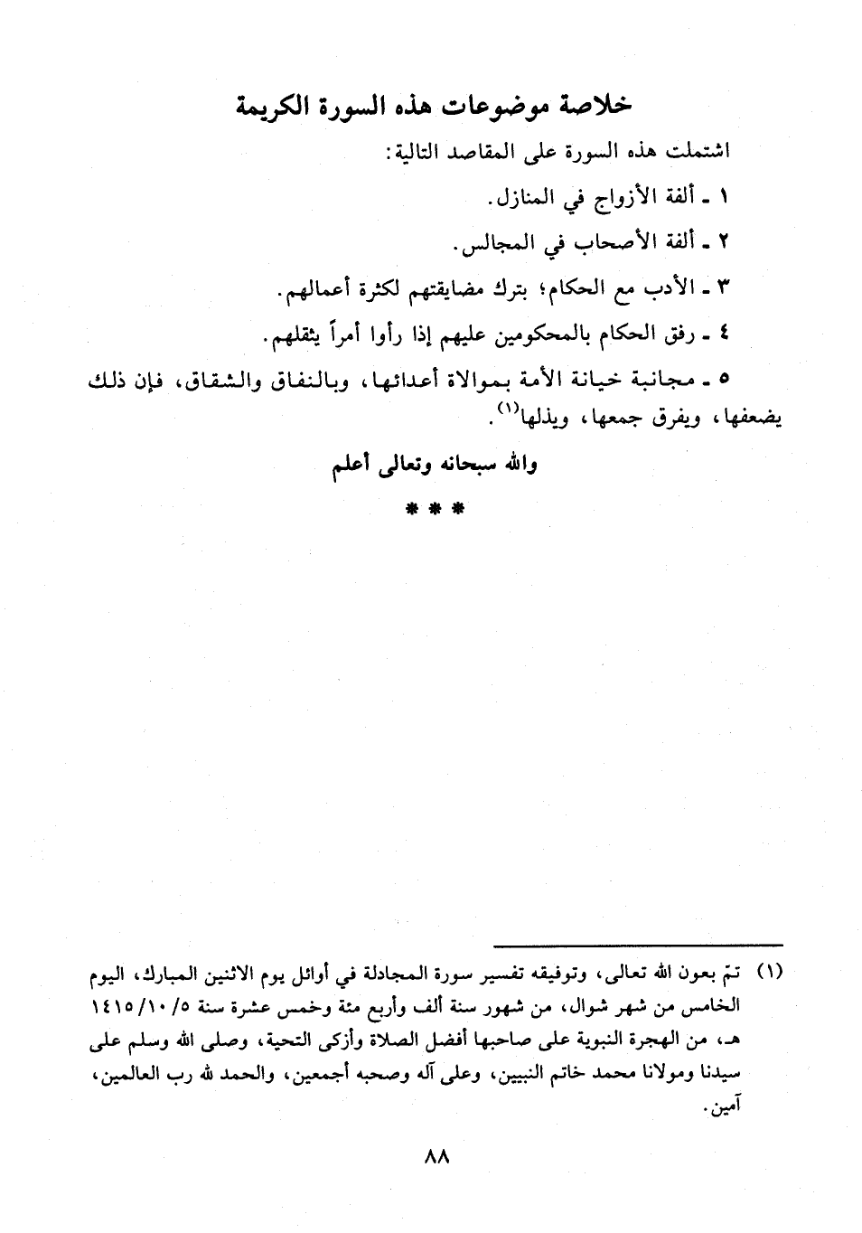 (¬1) تمّ بعون الله تعالى، وتوفيقه تفسير سورة المجادلة في أوائل يوم الاثنين المبارك، اليوم الخامس من شهر شوال، من شهور سنة ألف وأربع مئة وخمس عشرة سنة 5/ 10/ 1415 هـ، من الهجرة النبوية على صاحبها أفضل الصلاة وأزكى التحية، وصلى الله وسلم على سيدنا ومولانا محمد خاتم النبيين، وعلى آله وصحبه أجمعين، والحمد لله رب العالمين، آمين.