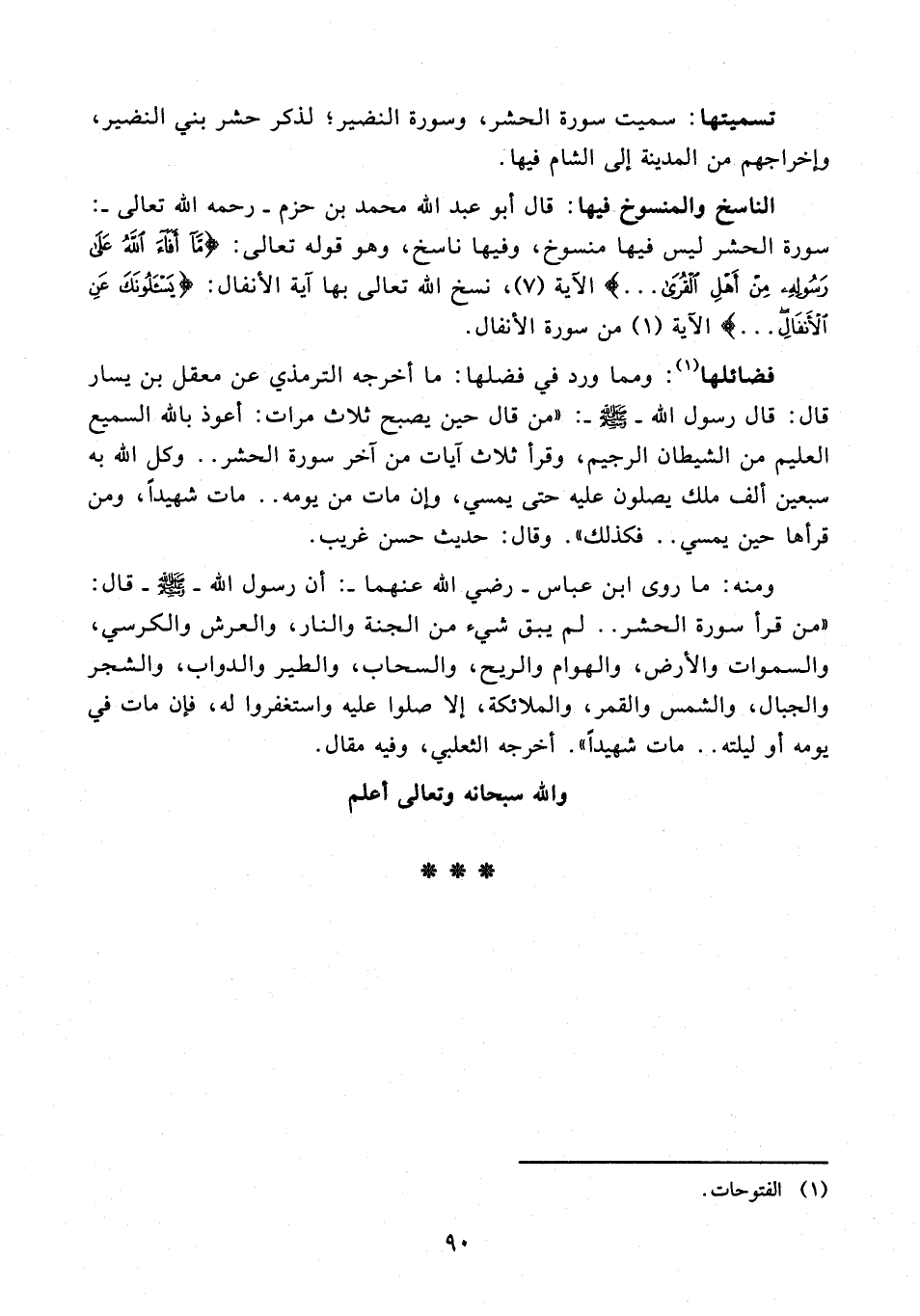 ومنه: ما روى ابن عباس - رضي الله عنهما -: أن رسول الله - صلى الله عليه وسلم - قال: "من قرأ سورة الحشر .. لم يبق شيء من الجنة والنار، والعرش والكرسي، والسموات والأرض، والهوام والريح، والسحاب، والطير والدواب، والشجر والجبال، والشمس والقمر، والملائكة، إلا صلوا عليه واستغفروا له، فإن مات في يومه أو ليلته .. مات شهيدًا". أخرجه الثعلبي، وفيه مقال.