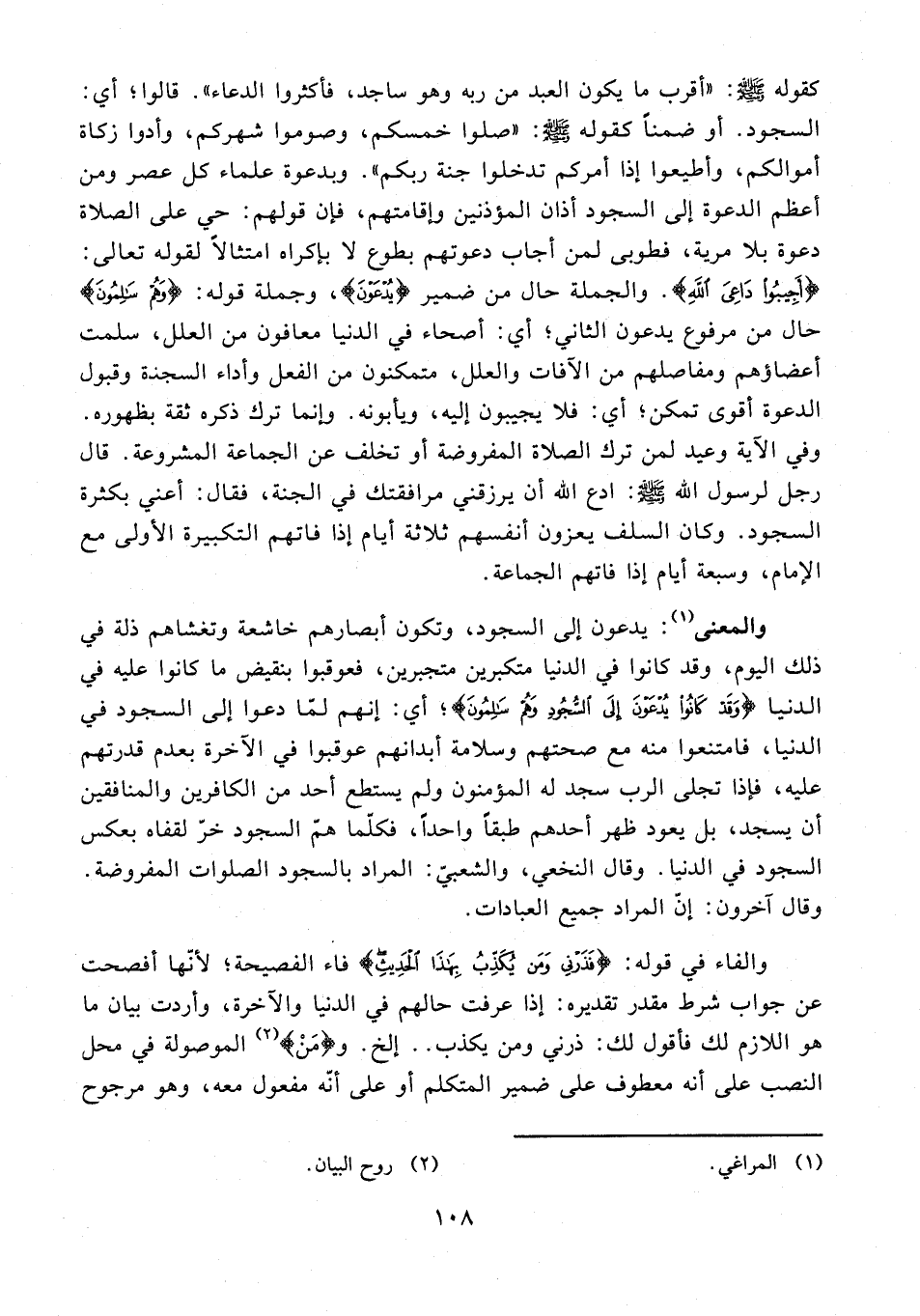 كقوله - صلى الله عليه وسلم -: "أقرب ما يكون العبد من ربه وهو ساجد، فأكثروا الدعاء". قالوا؛ أي: السجود. أو ضمنًا كقوله - صلى الله عليه وسلم -: "صلوا خمسكم، وصوموا شهركم، وأدوا زكاة أموالكم، وأطيعوا إذا أمركم تدخلوا جنة ربكم". وبدعوة علماء كل عصر ومن أعظم الدعوة إلى السجود أذان المؤذنين وإقامتهم، فإن قولهم: حي على الصلاة دعوة بلا مرية، فطوبى لمن أجاب دعوتهم بطوع لا بإكراه امتثالًا لقوله تعالى: {أجِيبُوا دَاعِيَ اللَّهِ}. والجملة حال من ضمير {يُدْعَوْنَ}، وجملة قوله: {وَهُمْ سَالِمُونَ} حال من مرفوع يدعون الثاني؛ أي: أصحاء في الدنيا معافون من العلل، سلمت أعضاؤهم ومفاصلهم من الآفات والعلل، متمكنون من الفعل وأداء السجدة وقبول الدعوة أقوى تمكن؛ أي: فلا يجيبون إليه، ويأبونه. وإنما ترك ذكره ثقة بظهوره. وفي الآية وعيد لمن ترك الصلاة المفروضة أو تخلف عن الجماعة المشروعة. قال رجل لرسول الله - صلى الله عليه وسلم -: ادع الله أن يرزقني مرافقتك في الجنة، فقال: أعني بكثرة السجود. وكان السلف يعزون أنفسهم ثلاثة أيام إذا فاتهم التكبيرة الأولى مع الإِمام، وسبعة أيام إذا فاتهم الجماعة.