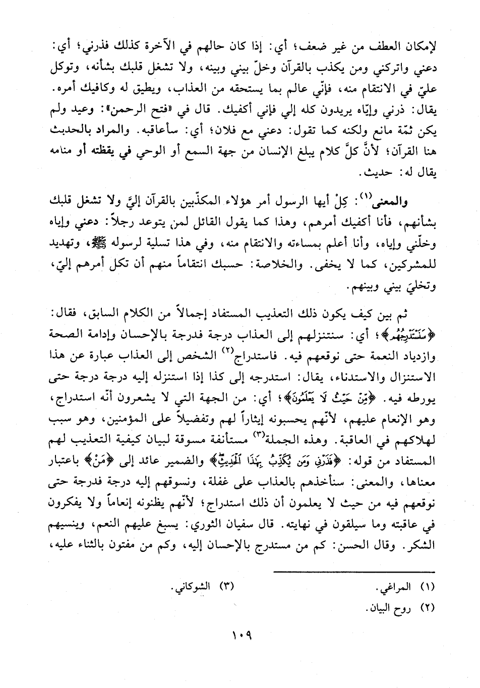 ثم بين كيف يكون ذلك التعذيب المستفاد إجمالًا من الكلام السابق، فقال: {سَنَسْتَدْرِجُهُمْ}؛ أي: سنتنزلهم إلى العذاب درجة فدرجة بالإحسان وإدامة الصحة وازدياد النعمة حتى نوقعهم فيه. فاستدراج (¬2) الشخص إلى العذاب عبارة عن هذا الاستنزال والاستدناء، يقال: استدرجه إلى كذا إذا استنزله إليه درجة درجة حتى يورطه فيه. {مِنْ حَيْثُ لَا يَعْلَمُونَ}؛ أي: من الجهة التي لا يشعرون أنّه استدراج، وهو الإنعام عليهم؛ لأنّهم يحسبونه إيثارًا لهم وتفضيلًا على المؤمنين، وهو سبب لهلاكهم في العاقبة. وهذه الجملة (¬3) مستأنفة مسوقة لبيان كيفية التعذيب لهم المستفاد من قوله: {فَذَرْنِي وَمَنْ يُكَذِّبُ بِهَذَا الْحَدِيثِ} والضمير عائد إلى {مَنْ} باعتبار معناها، والمعنى: سنأخذهم بالعذاب على غفلة، ونسوقهم إليه درجة فدرجة حتى نوقعهم فيه من حيث لا يعلمون أن ذلك استدراج؛ لأنّهم يظنونه إنعامًا ولا يفكرون في عاقبته وما سيلقون في نهايته. قال سفيان الثوري: يسبغ عليهم النعم، وينسيهم الشكر. وقال الحسن: كم من مستدرج بالإحسان إليه، وكم من مفتون بالثناء عليه،