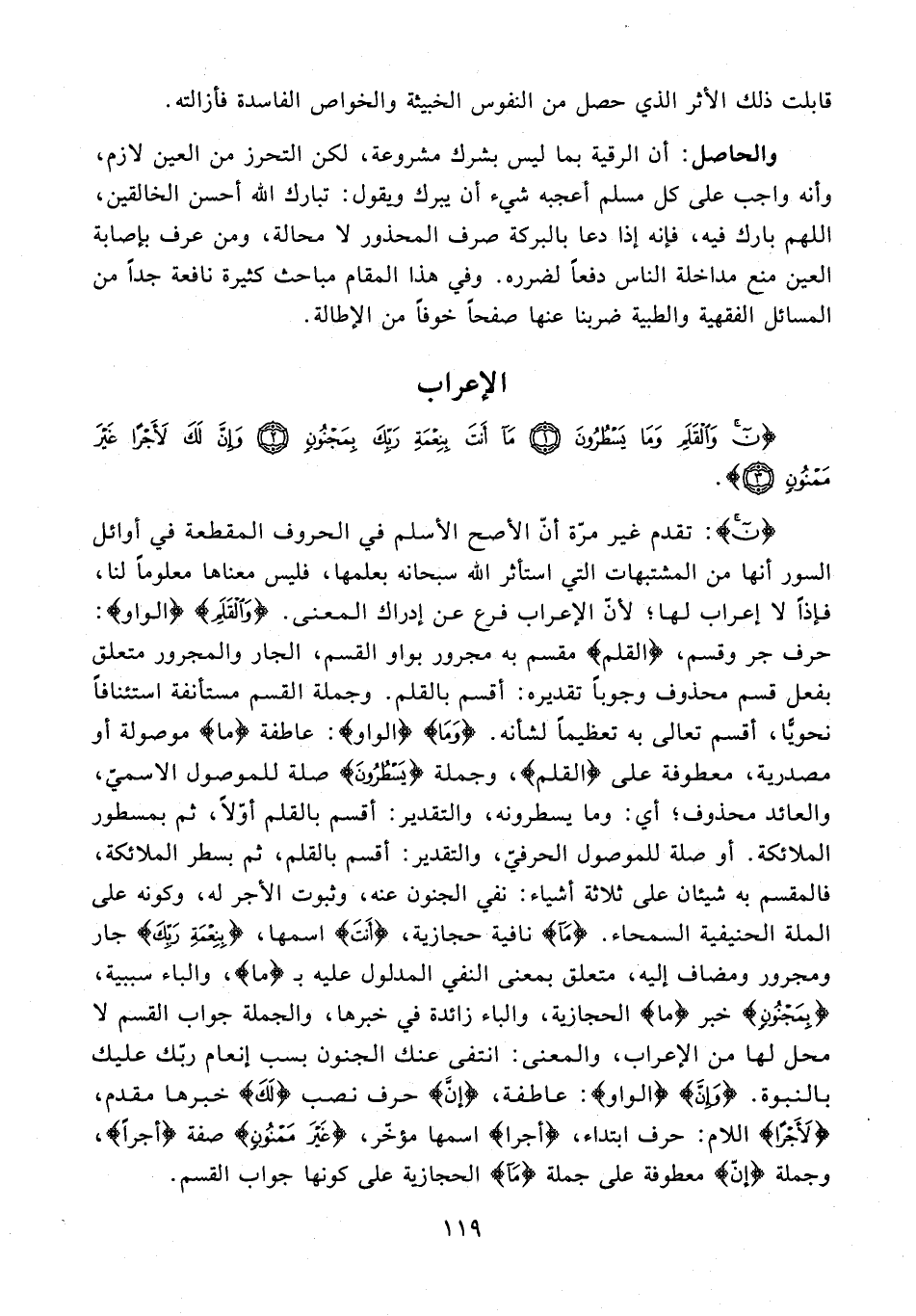 {ن}: تقدم غير مرّة أنّ الأصح الأسلم في الحروف المقطعة في أوائل السور أنها من المشتبهات التي استأثر الله سبحانه بعلمها، فليس معناها معلومًا لنا، فإذًا لا إعراب لها؛ لأن الإعراب فرع عن إدراك المعنى. {وَالْقَلَمِ} {الواو}: حرف جر وقسم، {القلم} مقسم به مجرور بواو القسم، الجار والمجرور متعلق بفعل قسم محذوف وجوبًا تقديره: أقسم بالقلم. وجملة القسم مستأنفة استئنافًا نحويًّا، أقسم تعالى به تعظيمًا لشأنه. {وَمَا} {الواو}: عاطفة {ما} موصولة أو مصدرية، معطوفة على {القلم}، وجملة {يَسْطُرُونَ} صلة للموصول الاسميّ، والعائد محذوف؛ أي: وما يسطرونه، والتقدير: أقسم بالقلم أوّلًا، ثم بمسطور الملائكة. أو صلة للموصول الحرفيّ، والتقدير: أقسم بالقلم، ثم بسطر الملائكة، فالمقسم به شيئان على ثلاثة أشياء: نفي الجنون عنه، وثبوت الأجر له، وكونه على الملة الحنيفية السمحاء. {مَا} نافية حجازية، {أَنْتَ} اسمها، {بِنِعْمَةِ رَبِّكَ} جار ومجرور ومضاف إليه، متعلق بمعنى النفي المدلول عليه بـ {ما}، والباء سببية، {بِمَجْنُونٍ} خبر {ما} الحجازية، والباء زائدة في خبرها، والجملة جواب القسم لا محل لها من الإعراب، والمعنى: انتفى عنك الجنون بسب إنعام ربّك عليك بالنبوة. {وَإِنَّ} {الواو}: عاطفة، {إنَّ} حوف نصب {لَكَ} خبرها مقدم، {لَأَجْرًا} اللام: حرف ابتداء، {أجرا} اسمها مؤخر، {غَيْرَ مَمْنُونٍ} صفة {أجرًا}، وجملة {إنّ} معطوفة على جملة {مَا} الحجازية على كونها جواب القسم.