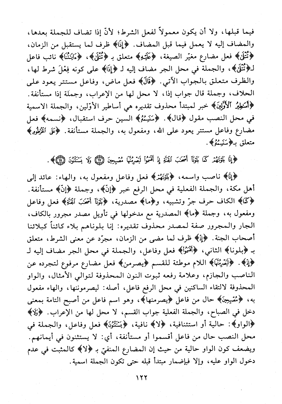 {إِنَّا} ناصب واسمه، {بَلَوْنَاهُمْ} فعل وفاعل ومفعول به، والهاء: عائد إلى أهل مكة، والجملة الفعلية في محل الرفع خبر {إنّ}، وجملة {إنّ} مستأنفة. {كَمَا} الكاف حرف جرّ وتشبيه، و {ما} مصدرية، {بَلَوْنَا أَصْحَابَ الْجَنَّةِ} فعل وفاعل ومفعول به، وجملة {ما} المصدرية مع مدخولها في تأويل مصدر مجرور بالكاف، الجار والمجرور صفة لمصدر محذوف تقديره: إنا بلوناهم بلاء كائنًا كبلائنا أصحاب الجنة. {إذ} ظرف لما مضى من الزمان، مجرّد عن معنى الشرط، متعلق بـ {بلونا} الثاني، {أَقْسَمُوا} فعل وفاعل، والجملة في محل الجر مضاف إليه لـ {إِذْ}. {لَيَصْرِمُنَّهَا} اللام موطئة للقسم {يصرمن} فعل مضارع مرفوع لتجرده عن الناصب والجازم، وعلامة رفعه ثبوت النون المحذوفة لتوالي الأمثال، والواو المحذوفة لالتقاء الساكنين في محل الرفع فاعل، أصله: ليصرموننها، والهاء مفعول به، {مُصْبِحِينَ} حال من فاعل {يصرمنها}، وهو اسم فاعل من أصبح التامة بمعنى دخل في الصباح، والجملة الفعلية جواب القسم، لا محل لها من الإعراب. {وَلَا} {الواو}: حالية أو استئنافية، {لا} نافية، {يَسْتَثْنُونَ} فعل وفاعل، والجملة في محل النصب حال من فاعل أقسموا أو مستأنفة، أي: لا يستثنون في أيمانهم. ويضعف كون الواو حالية من حيث إن المضارع المنفيّ بـ {لا} كالمثبت في عدم في خول الواو عليه، وإلا فبإضمار مبتدأ قبله حتى تكون الجملة اسمية.