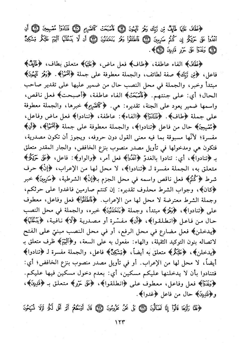 {فَطَافَ} الفاء عاطفة، {طاف} فعل ماض، {عَلَيْهَا} متعلق بطاف، {طَائِفٌ} فاعل، {مِنْ رَبِّكَ} صفة لطائف، والجملة معطوفة على جملة {أَقْسَمُوا}. {وَهُمْ نَائِمُونَ} مبتدأ وخبر، والجملة في محل النصب حال من ضمير عليها على تقدير صاحب الحال؛ أي: على جنتهم. {فَأَصْبَحَتْ} الفاء عاطفة، {أصبحت} فعل ناقص، واسمها ضمير يعود على الجنة، تقديره: هي. {كَالصَّرِيمِ} خبرها، والجملة معطوفة على جملة {طاف}. {فَتَنَادَوا} {الفاء}: عاطفة، {تنادوا} فعل ماض وفاعل، {مُصْبِحِينَ} حال من فاعل {تنادوا}، والجملة معطوفة على جملة {أَقْسَمُوا}، {أَنِ} مفسرة؛ لأنّها مسبوقة بما فيه معنى القول دون حروفه، ويجوز أن تكون مصدرية، فتكون هي ومدخولها في تأويل مصدر منصوب بنزع الخافض، والجار المقدر متعلق بـ {تنادوا}، أي: تنادوا بالغدوّ {اغْدُوا} فعل أمر، {والواو}: فاعل، {عَلَى حَرْثِكُمْ} متعلق به، الجملة مفسرة لـ {تنادواو}، لا محل لها من الإعراب، {إنْ} حرف شرط {كُنُتم} فعل ناقص واسمه في محل الجزم بـ {إنْ} الشرطية، {صَارِمِينَ} خبر {كان}، وجواب الشرط محذوف تقديره: إن كنتم صارمين فاغدوا على حرثكم، وجملة الشرط معترضة لا محل لها من الإعراب. {فَانْطَلَقُوا} فعل وفاعل، معطوف على {تنادوا}، {وَهُمْ} مبتدأ، وجملة {يَتَخَافَتُونَ} خبره، والجملة في محل النصب حال من فاعل {انطلقوا}، {أَن} مفسّرة أو مصدرية {لا} نافية، {يَدْخُلَنَّهَا} {يدخلن} فعل مضارع في محل الرفع، أو في محل النصب مبنيّ على الفتح لاتصاله بنون التوكيد الثقيلة، والهاء: مفعول به على السعة، و {الْيَوْمَ} ظرف متعلق بـ {يدخلن}، {عَلَيْكُمْ} متعلق به أيضًا، {مِسْكِينٌ} فاعل، والجملة مفسرة لـ {تنادوا} أيضًا، لا محل لها من الإعراب. أو في تأويل مصدر منصوب بنزع الخافض؛ أي: فتنادوا بأن لا يدخلنها عليكم مسكين، أي: بعدم دخول مسكين فيها عليكم. {وَغَدَوْا} فعل وفاعل، معطوف على {انطلقوا}، {عَلَى حَرْدٍ} متعلق بـ {قَادِريِنَ}، و {قَادِريِنَ} حال من فاعل {غدوا}.