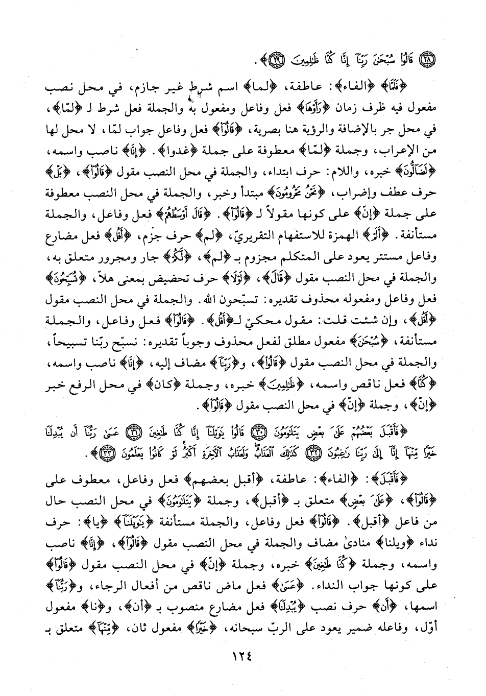 {فَأَقْبَلَ}: {الفاء}: عاطفة، {أقبل بعضهم} فعل وفاعل، معطوف على {قَالُوا}، {عَلَى بَعْضٍ} متعلق بـ {أقبل}، وجملة {يَتَلَاوَمُونَ} في محل النصب حال من فاعل {أقبل}. {قَالُوا} فعل وفاعل، والجملة مستأنفة {يَا وَيْلَنَا} {يَا}: حرف نداء {ويلنا} منادى مضاف والجملة في محل النصب مقول {قَالُوا}، {إِنَّا} ناصب واسمه، وجملة {كُنَّا طَاغِينَ} خبره، وجملة {إن} في محل النصب مقول {قَالُوا} على كونها جواب النداء. {عَسَى} فعل ماض ناقص من أفعال الرجاء، و {رَبُّنَا} اسمها، {أَن} حرف نصبـ {يُبْدِلَنَا} فعل مضارع منصوب بـ {أن}، و {نا} مفعول أوّل، وفاعله ضمير يعود على الربّ سبحانه، {خَيْرًا} مفعول ثان، {مِنْهَا} متعلق بـ