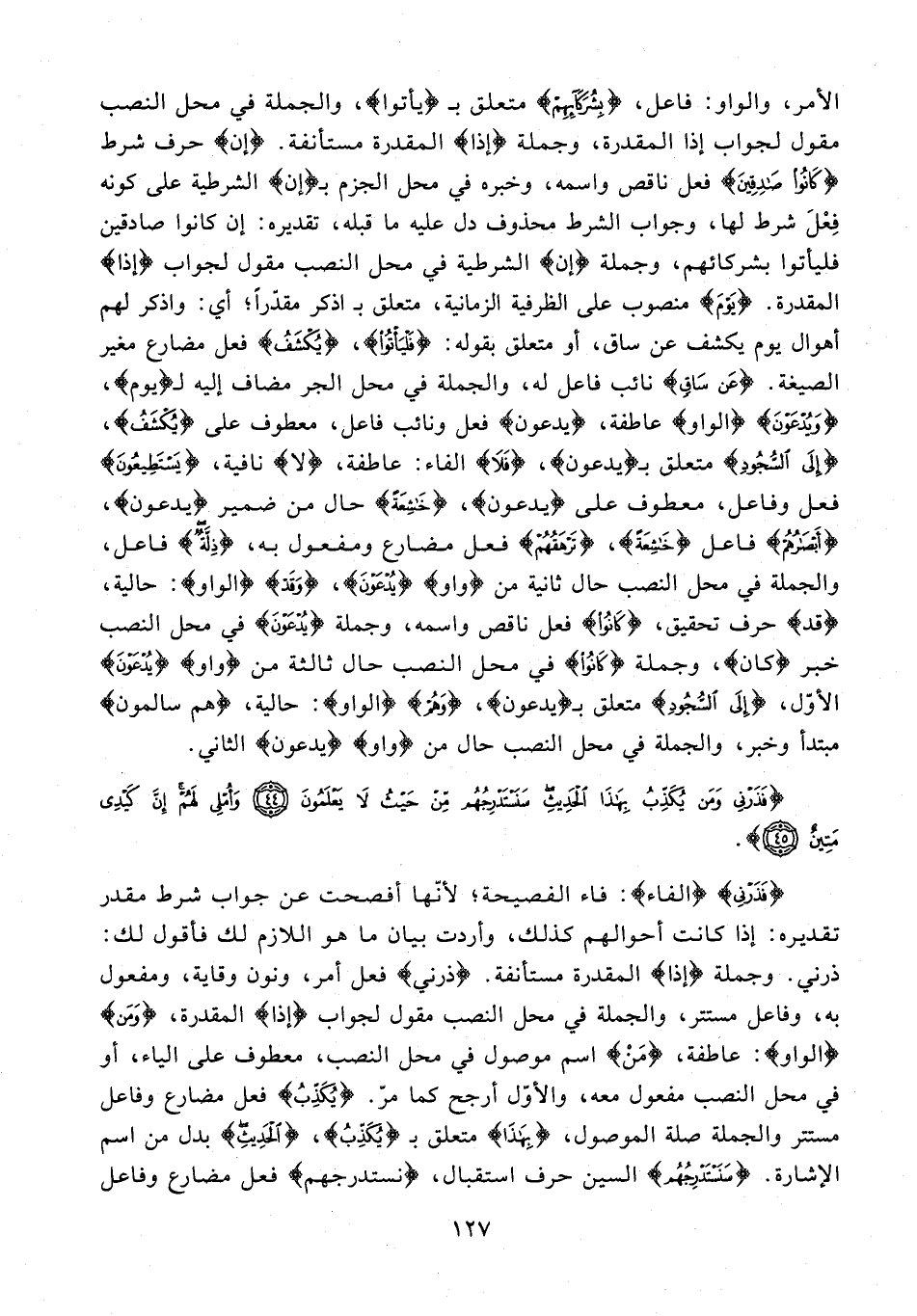 {فَذَرْنِي} {الفاء}: فاء الفصيحة؛ لأنّها أفصحت عن جواب شرط مقدر تقديره: إذا كانت أحوالهم كذلك، وأردت بيان ما هو اللازم لك فأقول لك: ذرني. وجملة {إذا} المقدرة مستأنفة. {ذرني} فعل أمر، ونون وقاية، ومفعول به، وفاعل مستتر، والجملة في محل النصب مقول لجواب {إذا} المقدرة، {وَمَن} {الواو}: عاطفة، {مَنْ} اسم موصول في محل النصب، معطوف على الياء، أو في محل النصب مفعول معه، والأوّل أرجح كما مرّ. {يُكَذِّبُ} فعل مضارع وفاعل مستتر والجملة صلة الموصول، {بِهَذَا} متعلق بـ {يُكَذِّبُ}، {الْحَدِيثِ} بدل من اسم الإشارة. {سَنَسْتَدْرِجُهُمْ} السين حرف استقبال، {نستدرجهم} فعل مضارع وفاعل