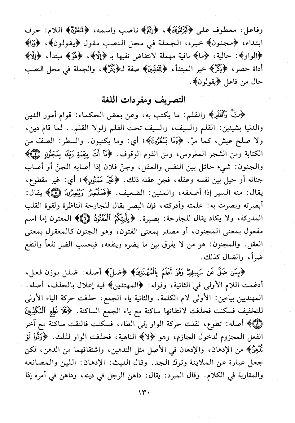 {ن وَالْقَلَمِ} والقلم: ما يكتب به، وعن بعض الحكماء: قوام أمور الدين والدنيا بشيئين: القلم والسيف، والسيف تحت القلم ولولا القلم .. لما قام دين، ولا صلح عيش، كما مرّ. {وَمَا يَسْطُرُونَ}؛ أي: وما يكتبون. والسطر: الصفّ من الكتابة ومن الشجر المغروس، ومن القوم الوقوف. {مَا أَنْتَ بِنِعْمَةِ رَبِّكَ بِمَجْنُونٍ (2)} والجنون: شيء حائل بين النفس والعقل، وجنّ فلان إذا أصابه الجن أو أصاب جنانه أو حيل بين نفسه وعقله، فجن عقله ذلك. {غَيْرَ مَمْنُونٍ}؛ أي: غير مقطوع، يقال: منه السير إذا أضعفه، والمنين: الضعيف. {فَسَتُبْصِرُ وَيُبْصِرُونَ (5)} يقال: أبصرته وبصرت به: علمته وأدركته، فإن البصر يقال للجارحة الناظرة ولقوة القلب المدركة، ولا يكاد يقال للجارحة: بصيرة. {بِأَيِّكُمُ الْمَفْتُونُ (6)} المفتون إما اسم مفعول بمعنى المجنون، أو مصدر بمعنى الفتون، وهو الجنون كالمعقول بمعنى العقل. والمجنون: هو من لا يفرق بين ما يضره وينفعه، فيحسب التفسير نفعًا والنفع ضرًا، والضال كذلك.