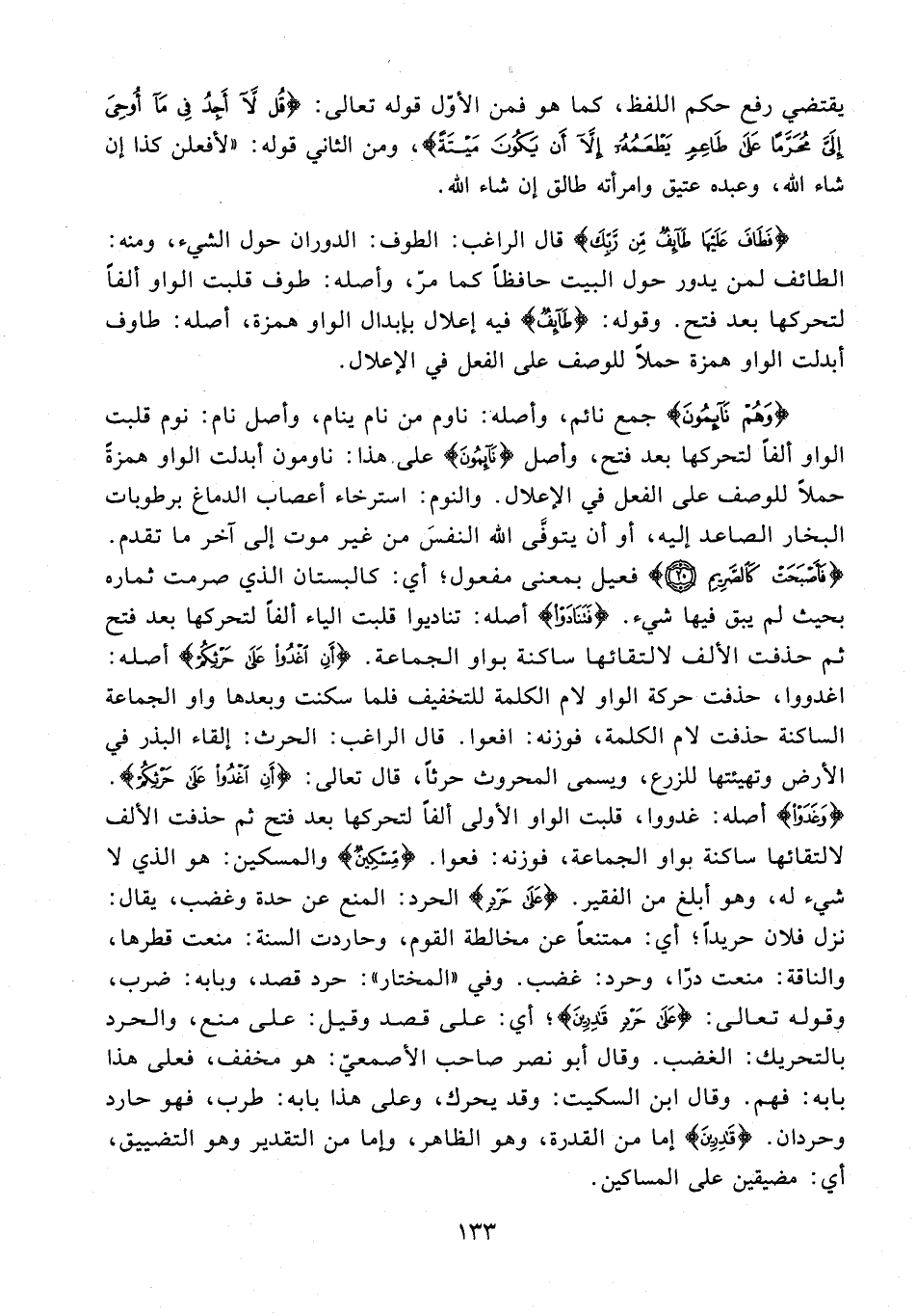 {وَهُمْ نَائِمُونَ} جمع نائم، وأصله: ناوم من نام ينام، وأصل نام: نوم قلبت الواو ألفًا لتحركها بعد فتح، وأصل {نَائِمُونَ} على هذا: ناومون أبدلت الواو همزةً حملًا للوصف على الفعل في الإعلال. والنوم: استرخاء أعصاب الدماغ برطوبات البخار الصاعد إليه، أو أن يتوفَّى الله النفسَ من غير موت إلى آخر ما تقدم. {فَأَصْبَحَتْ كَالصَّرِيمِ (20)} فعيل بمعنى مفعول؛ أي: كالبستان الذي صرمت ثماره بحيث لم يبق فيها شيء. {فَتَنَادَوْا} أصله: تناديوا قلبت الياء ألفًا لتحركها بعد فتح ثم حذفت الألف لالتقائها ساكنة بواو الجماعة. {أَنِ اغْدُوا عَلَى حَرْثِكُمْ} أصله: اغدووا، حذفت حركة الواو لام الكلمة للتخفيف فلما سكنت وبعدها واو الجماعة الساكنة حذفت لام الكلمة، فوزنه: افعوا. قال الراغب: الحرث: إلقاء البذر في الأرض وتهيئتها للزرع، ويسمى المحروث حرثًا، قال تعالى: {أَنِ اغْدُوا عَلَى حَرْثِكُمْ}. {وَغَدَوْا} أصله: غدووا، قلبت الواو الأولى ألفًا لتحركها بعد فتح ثم حذفت الألف لالتقائها ساكنة بواو الجماعة، فوزنه: فعوا. {مِسْكِينٌ} والمسكين: هو الذي لا شيء له، وهو أبلغ من الفقير. {عَلَى حَرْدٍ} الحرد: المنع عن حدة وغضب، يقال: نزل فلان حريدًا؛ أي: ممتنعًا عن مخالطة القوم، وحاردت السنة: منعت قطرها، والناقة: منعت درّا، وحرد: غضب. وفي "المختار": حرد قصد، وبابه: ضرب، وقوله تعالى: {عَلَى حَرْدٍ قَادِرِينَ}؛ أي: على قصد وقيل: على منع، والحرد بالتحريك: الغضب. وقال أبو نصر صاحب الأصمعيّ: هو مخفف، فعلى هذا بابه: فهم. وقال ابن السكيت: وقد يحرك، وعلى هذا بابه: طرب، فهو حارد وحردان. {قَادِرِينَ} إما من القدرة، وهو الظاهر، وإما من التقدير وهو التضييق، أي: مضيقين علي المساكين.