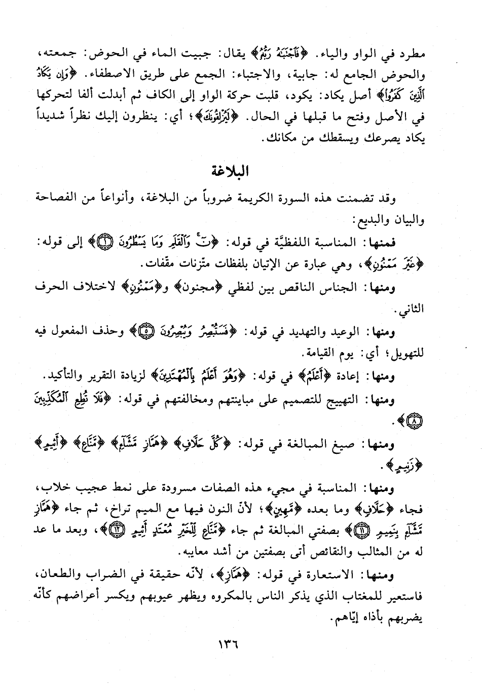 مطرد في الواو والياء. {فَاجْتَبَاهُ رَبُّهُ} يقال: جبيت الماء في الحوض: جمعته، والحوض الجامع له: جابية، والاجتباء: الجمع على طريق الاصطفاء. {وَإِنْ يَكَادُ الَّذِينَ كَفَرُوا} أصل يكاد: يكون، قلبت حركة الواو إلى الكاف ثم أبدلت ألفا لتحركها في الأصل وفتح ما قبلها في الحال. {لَيُزْلقُونَكَ}؛ أي: ينظرون إليك نظرًا شديدًا يكاد يصرعك ويسقطك من مكانك.