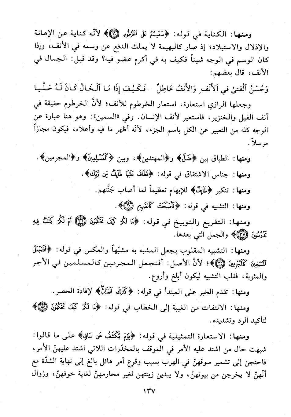 ومنها: الكناية في قوله: {سَنَسِمُهُ عَلَى الْخُرْطُومِ (16)} لأنه كناية عن الإهانة والإذلال والاستيلاد؛ إذ صار كالبهيمة لا يملك الدفع عن وسمه في الأنف، وإذا كان الوسم في الوجه شيئًا فكيف به في أكرم عضو فيه؟ وقد قيل: الجمال في الأنف، قال بعضهم: