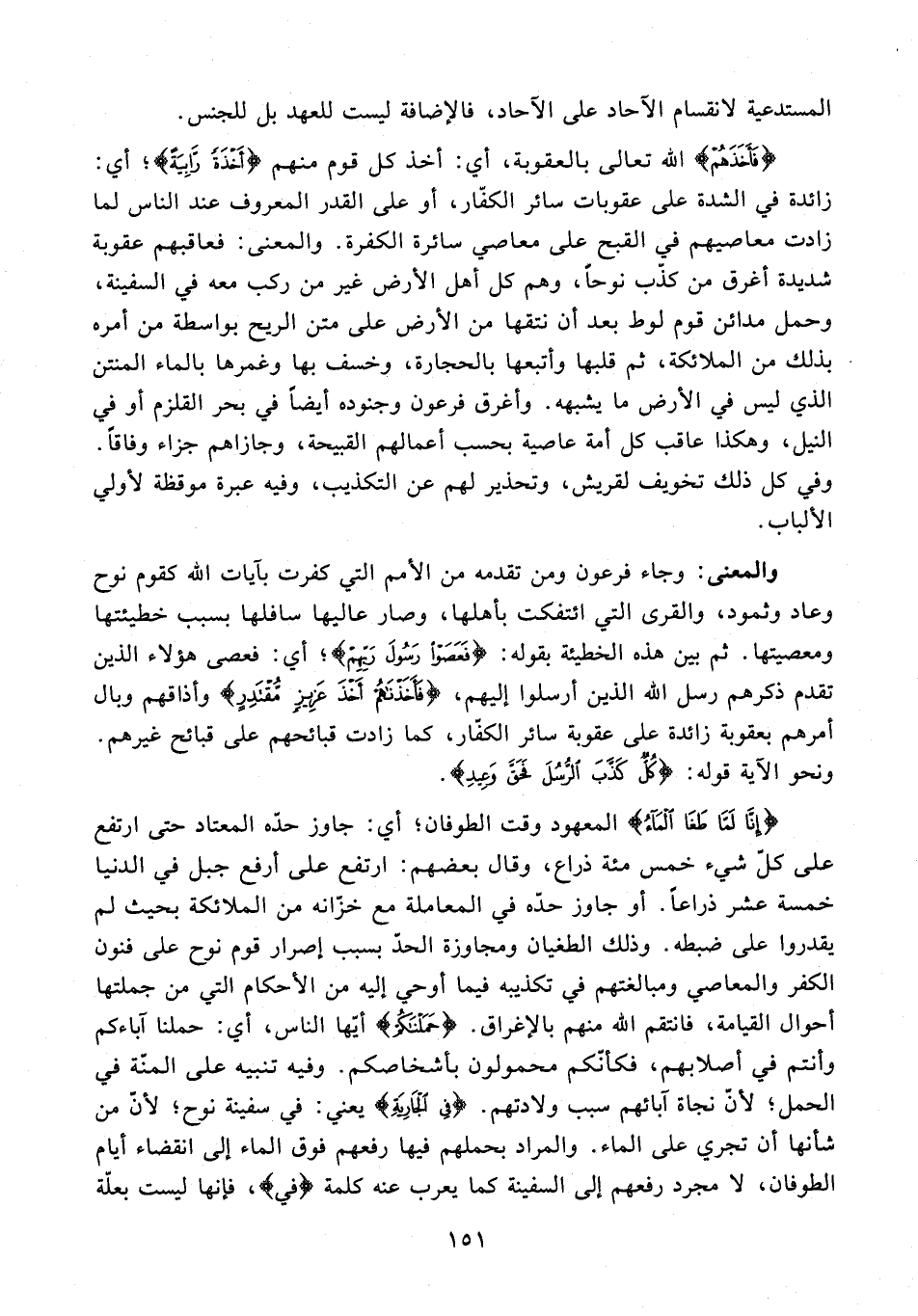 11 - {إِنَّا لَمَّا طَغَى الْمَاءُ} المعهود وقت الطوفان؛ أي: جاوز حدّه المعتاد حتى ارتفع على كل شيء خمس مئة ذراع، وقال بعضهم: ارتفع على أرفع جبل في الدنيا خمسة عشر ذراعًا. أو جاوز حذه في المعاملة مع خزّانه من الملائكة بحيث لم يقدروا على ضبطه. وذلك الطغيان ومجاوزة الحدّ بسبب إصرار قوم نوح على فنون الكفر والمعاصي ومبالغتهم في تكذيبه فيما أوحي إليه من الأحكام التي من جملتها أحوال القيامة، فانتقم الله منهم بالإغراق. {حَمَلْنَاكُمْ} أيّها الناس، أي: حملنا آباءكم وأنتم في أصلابهم، فكأنّكم محمولون بأشخاصكم. وفيه تنبيه على المنّة في الحمل؛ لأنّ نجاة آبائهم سبب ولادتهم. {فِي الْجَارِيَةِ} يعني: في سفينة نوح؛ لأنّ من شأنها أن تجري على الماء. والمراد بحملهم فيها رفعهم فوق الماء إلى انقضاء أيام الطوفان، لا مجرد رفعهم إلى السفينة كما يعرب عنه كلمة {في}، فإنها ليست بعلّة