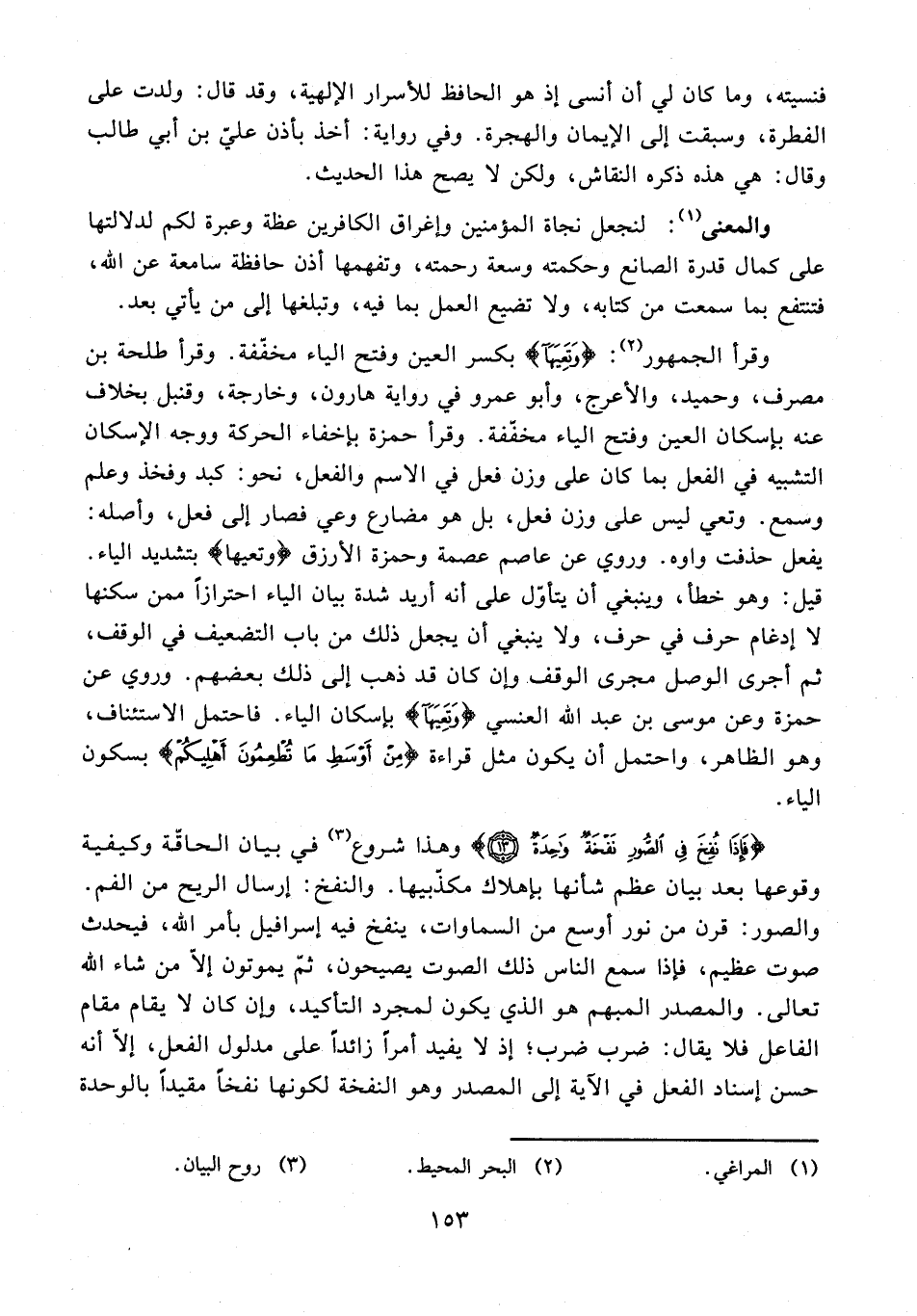 13 - {فَإِذَا نُفِخَ فِي الصُّورِ نَفْخَةٌ وَاحِدَةٌ (13)} وهذا شروع (¬3) في بيان الحاقّة وكيفية وقوعها بعد بيان عظم شأنها بإهلاك مكذّبيها. والنفخ: إرسال الريح من الفم. والصور: قرن من نور أوسع من السماوات، ينفخ فيه إسرافيل بأمر الله، فيحدث صوت عظيم، فإذا سمع الناس ذلك الصوت يصيحون، ثمّ يموتون إلّا من شاء الله تعالى. والمصدر المبهم هو الذي يكون لمجرد التأكيد، وإن كان لا يقام مقام الفاعل فلا يقال: ضرب ضرب؛ إذ لا يفيد أمرًا زائدًا على مدلول الفعل، إلّا أنه حسن إسناد الفعل في الآية إلى المصدر وهو النفخة لكونها نفخًا مقيدًا بالوحدة