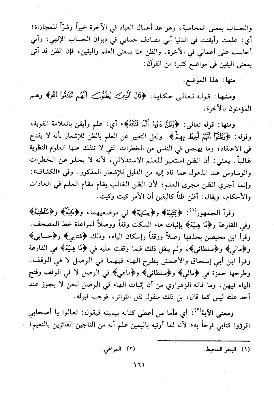 والحساب بمعنى المحاسبة، وهو عد أعمال العباد في الآخرة خيرًا وشرًّا للمجازاة؛ أي: علمت وأيقنت في الدنيا أني مصادف حسابي في ديوان الحساب الإلهي، وأني أحاسب على أعمالي في الآخرة. والظن هنا بمعنى العلم واليقين، فإن الظن قد أتى بمعنى اليقين في مواضع كثيرة من القرآن: