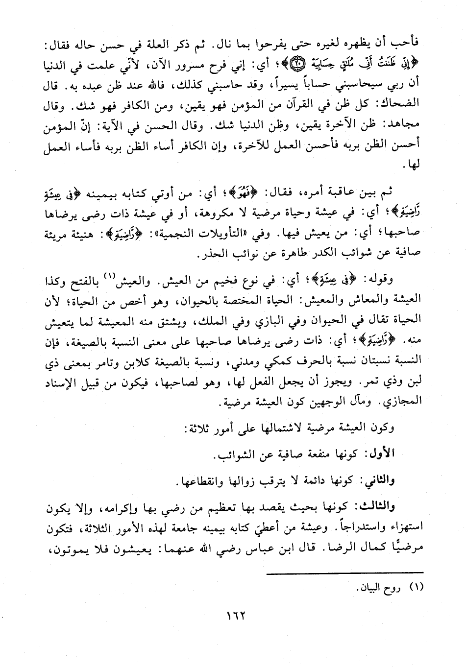 والثالث: كونها بحيث يقصد بها تعظيم من رضي بها وإكرامه، وإلا يكون استهزاء واستدراجًا. وعيشة من أعطيَ كتابه بيمينه جامعة لهذه الأمور الثلاثة، فتكون مرضيًّا كمال الرضا. قال ابن عباس رضي الله عنهما: يعيشون فلا يموتون،