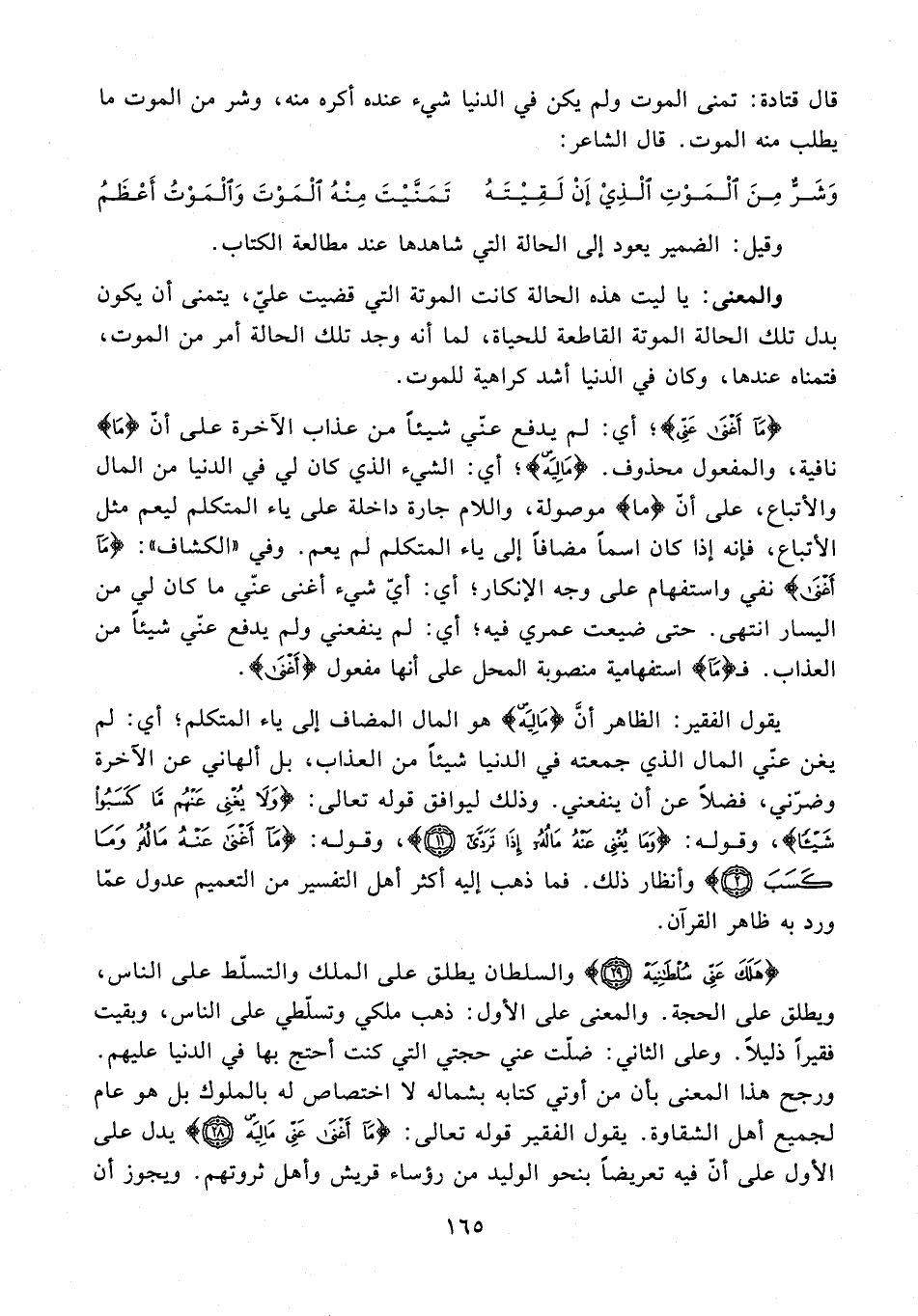 يقول الفقير: الظاهر أنَّ {مَالِيَهْ} هو المال المضاف إلى ياء المتكلم؛ أي: لم يغن عنّي المال الذي جمعته في الدنيا شيئًا من العذاب، بل ألهاني عن الآخرة وضرّني، فضلًا عن أن ينفعني. وذلك ليوافق قوله تعالى: {وَلَا يُغْنِي عَنْهُمْ مَا كَسَبُوا شَيْئًا}، وقوله: {وَمَا يُغْنِي عَنْهُ مَالُهُ إِذَا تَرَدَّى (11)}، وقوله: {مَا أَغْنَى عَنْهُ مَالُهُ وَمَا كَسَبَ (2)} وأنظار ذلك. فما ذهب إليه أكثر أهل التفسير من التعميم عدول عمّا ورد به ظاهر القرآن.