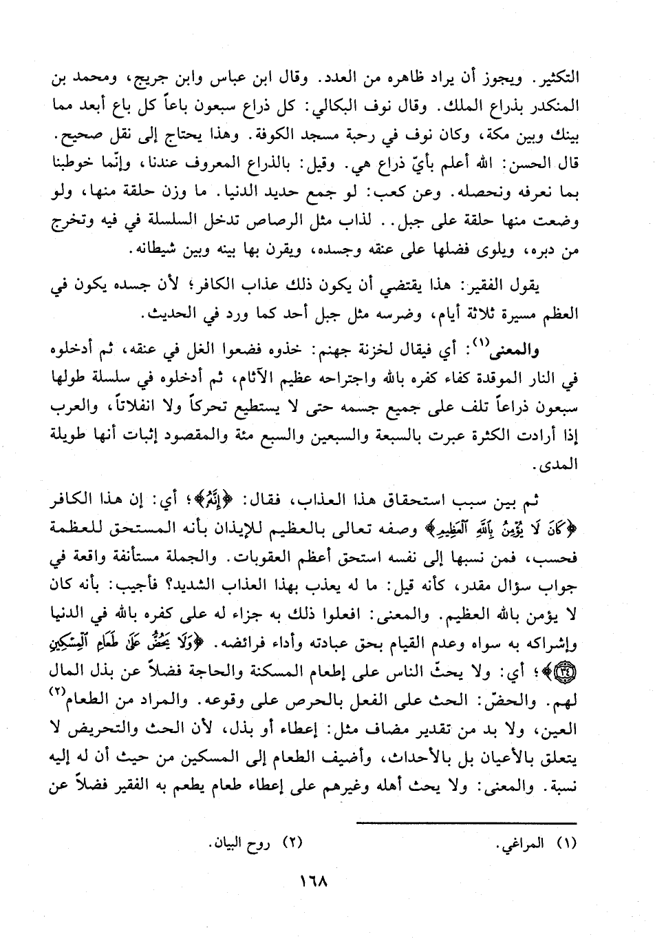 34 - {وَلَا يَحُضُّ عَلَى طَعَامِ الْمِسْكِينِ (34)}؛ أي: ولا يحثّ الناس على إطعام المسكنة والحاجة فضلًا عن بذل المال لهم. والحضّ: الحث على الفعل بالحرص على وقوعه. والمراد من الطعام (¬2) العين، ولا بد من تقدير مضاف مثل: إعطاء أو بذل؛ لأن الحث والتحريض لا يتعلق بالأعيان بل بالأحداث، وأضيف الطعام إلى المسكين من حيث أن له إليه نسبة. والمعنى: ولا يحث أهله وغيرهم على إعطاء طعام يطعم به الفقير فضلًا عن