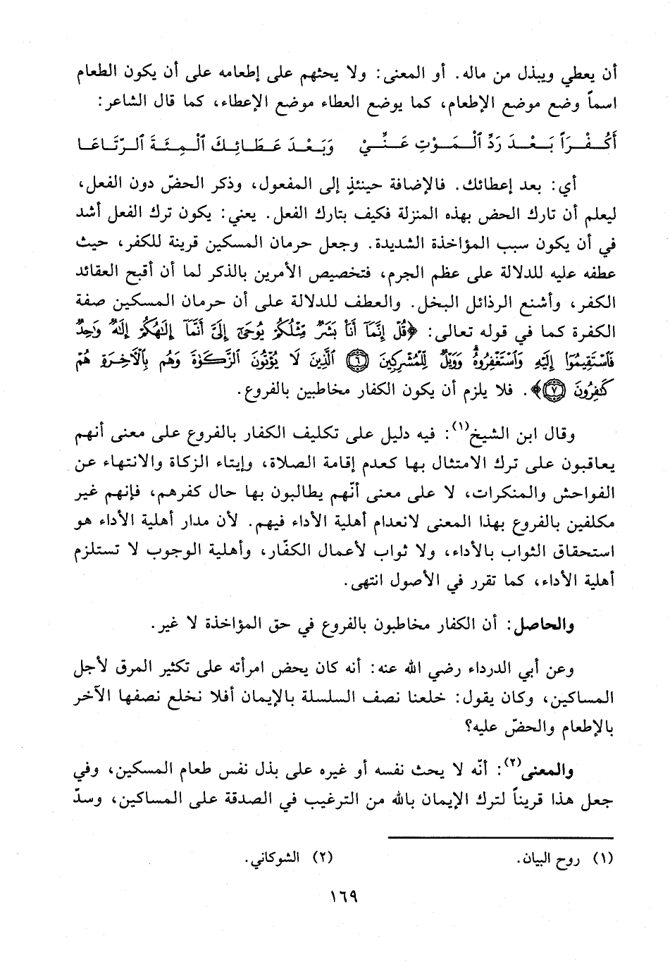 وقال ابن الشيخ (¬1): فيه دليل على تكليف الكفار بالفروع على معنى أنهم يعاقبون على ترك الامتثال بها كعدم إقامة الصلاة، وإيتاء الزكاة والانتهاء عن الفواحش والمنكرات، لا على معنى أنّهم يطالبون بها حال كفرهم، فإنهم غير مكلفين بالفروع بهذا المعنى لانعدام أهلية الأداء فيهم. لأن مدار أهلية الأداء هو استحقاق الثواب بالأداء، ولا ثواب لأعمال الكفّار، وأهلية الوجوب لا تستلزم أهلية الأداء، كما تقرر في الأصول انتهى.