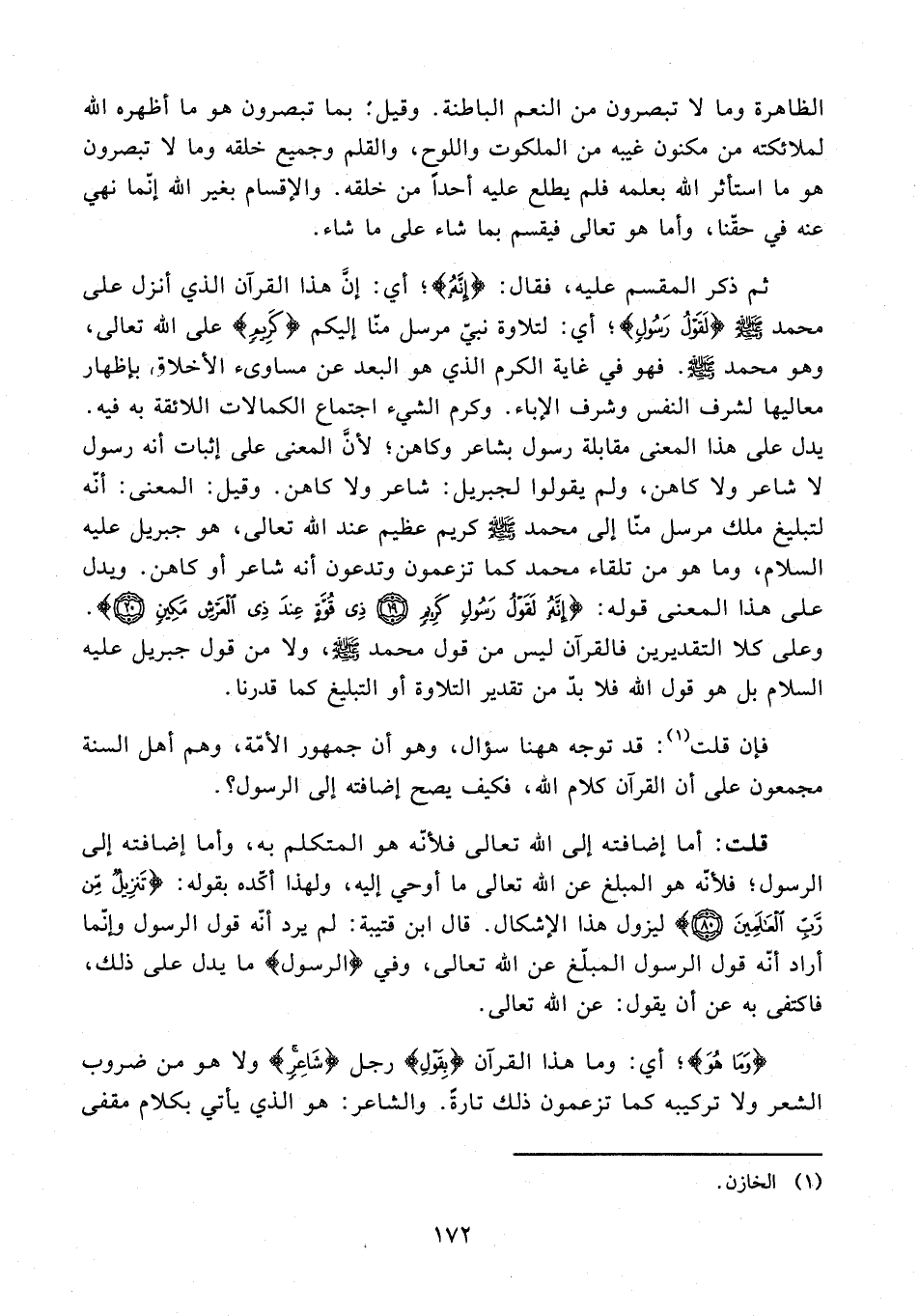 40 - ثم ذكر المقسم عليه، فقال: {إِنَّهُ}؛ أي: إنَّ هذا القرآن الذي أنزل على محمد - صلى الله عليه وسلم - {لَقَوْلُ رَسُولٍ}؛ أي: لتلاوة نبيّ مرسل منّا إليكم {كَرِيمٍ} على الله تعالى، وهو محمد - صلى الله عليه وسلم -. فهو في غاية الكرم الذي هو البعد عن مساوىء الأخلاق بإظهار معاليها لشرف النفس وشرف الإباء. وكرم الشيء اجتماع الكمالات اللائقة به فيه. يدل على هذا المعنى مقابلة رسول بشاعر وكاهن؛ لأنَّ المعنى على إثبات أنه رسول لا شاعر ولا كاهن، ولم يقولوا لجبريل: شاعر ولا كاهن. وقيل: المعنى: أنّه لتبليغ ملك مرسل منّا إلى محمد - صلى الله عليه وسلم - كريم عظيم عند الله تعالى، هو جبريل عليه السلام، وما هو من تلقاء محمد كما تزعمون وتدعون أنه شاعر أو كاهن. ويدل على هذا المعنى قوله: {إِنَّهُ لَقَوْلُ رَسُولٍ كَرِيمٍ (19) ذِي قُوَّةٍ عِنْدَ ذِي الْعَرْشِ مَكِينٍ (20)}. وعلى كلا التقديرين فالقرآن ليس من قول محمد - صلى الله عليه وسلم -، ولا من قول جبريل عليه السلام بل هو قول الله فلا بدّ من تقدير التلاوة أو التبليغ كما قدرنا.