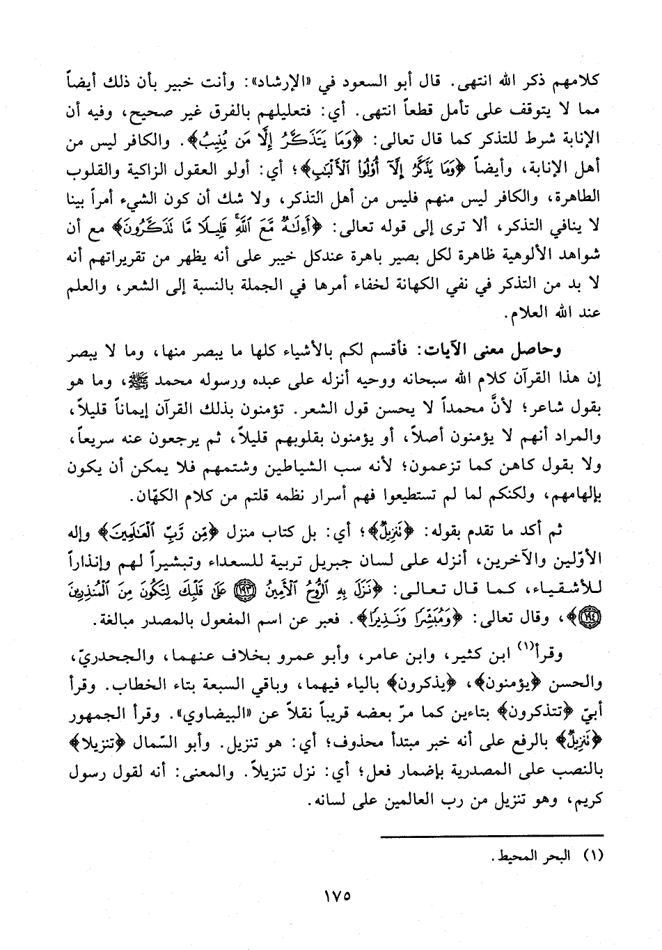 وقرأ (¬1) ابن كثير، وابن عامر، وأبو عمرو بخلاف عنهما، والجحدريّ، والحسن {يؤمنون}، {يذكرون} بالياء فيهما، وباقي السبعة بتاء الخطاب. وقرأ أبيّ {تتذكرون} بتاءين كما مرّ بعضه قريبًا نقلًا عن "البيضاوي". وقرأ الجمهور {تَنْزِيلٌ} بالرفع على أنه خبر مبتدأ محذوف؛ أي: هو تنزيل. وأبو السّمال {تنزيلا} بالنصب على المصدرية بضمار فعل؛ أي: نزل تنزيلًا. والمعنى: أنه لقول رسول كريم، وهو تنزيل من رب العالمين على لسانه.