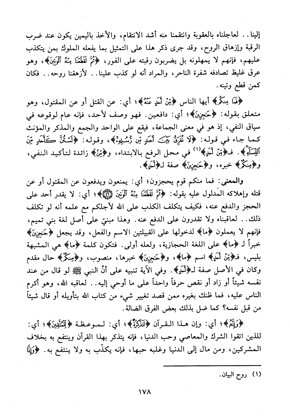 47 - {فَمَا مِنْكُمْ} أيها الناس {مِّنْ أَحَدٍ عنهُ}؛ أي: عن القتل أو عن المقتول، وهو متعلق بقوله: {حَاجِزِينَ}؛ أي: دافعين. فهو وصف لأحد، فإنه عام لوقوعه في سياق النفي، إذ هو في معنى الجماعة، فيقع على الواحد والجمع والمذكر والمؤنث كما جاء في قوله: {لَا نُفَرِّقُ بَيْنَ أَحَدٍ مِنْ رُسُلِهِ}، وقوله: {لَسْتُنَّ كَأَحَدٍ مِنَ النِّسَاءِ}. فـ {مِنْ أَحَدٍ} (¬1) في محل الرفع بالابتداء، و {مِنْ} زائدة لتأكيد النفي، و {مِنْكُمْ} خبره، و {حَاجِزِينَ} صفة لـ {أَحَدٍ}.