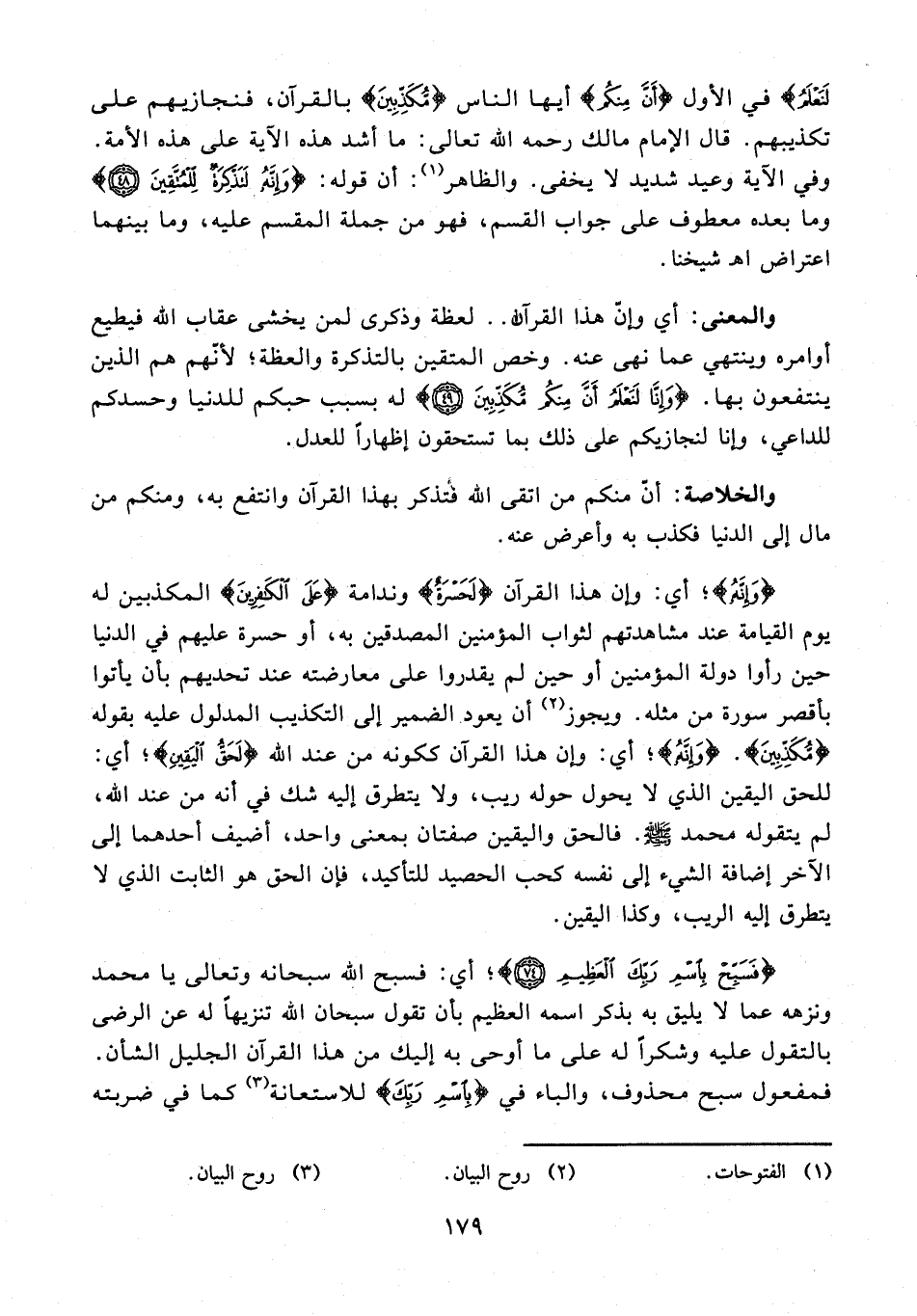 52 - {فَسَبِّحْ بِاسْمِ رَبِّكَ الْعَظِيمِ (52)}؛ أي: فسبح الله سبحانه وتعالى يا محمد ونزهه عما لا يليق به بذكر اسمه العظيم بأن تقول سبحان الله تنزيهًا له عن الرضى بالتقول عليه وشكرًا له على ما أوحى به إليك من هذا القرآن الجليل الشأن. فمفعول سبح محذوف، والباء في {بِاسْمِ رَبِّكَ} للاستعانة (¬3) كما في ضربته