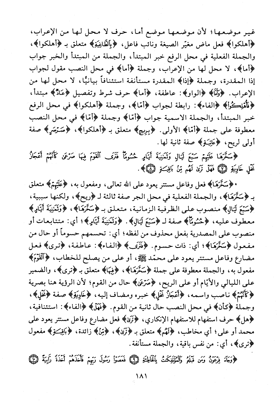 {سَخَّرَهَا} فعل وفاعل مستتر يعود على الله تعالى، ومفعول به، {عَلَيْهِمْ} متعلق بـ {سَخَّرَهَا}، والجملة الفعلية في محل الجر صفة ثالثة لـ {ريح}، ولكنها سببية، {سَبْعَ لَيَالٍ} منصوب على الظرفية الزمانية، متعلق بـ {سَخَّرَهَا}، {وَثَمَانِيَةَ أَيَّامٍ} معطوف عليه، {حُسُومًا} صفة لـ {سَبْعَ لَيَالٍ}. {وَثَمَانِيَةَ أَيَّامٍ}؛ أي: متتابعات أو منصوب على المصدرية بفعل محذوف من لفظه؛ أي: تحسمهم حسومًا أو حال من مفعول {سَخَّرَهَا}؛ أي: ذات حسوم. {فَتَرَى} {الفاء}: عاطفة، {ترى} فعل مضارع وفاعل مستتر يعود على محمّد - صلى الله عليه وسلم -، أو على من يصلح للخطاب، {الْقَوْمَ} مفعول به، والجملة معطوفة على جملة {سَخَّرَهَا}، {فِيهَا} متعلق بـ {ترى}، والضمير على الليالي والأيّام أو على الريح، {صَرْعَى} حال من القوم؛ لأن الرؤية هنا بصرية {كَأَنَّهُمْ} ناصب واسمه، {أَعْجَازُ نَخْلٍ} خبره ومضاف إليه، {خَاوِيَةٍ} صفة {نَخلٍ}، وجملة {كأن} في محل النصب حال ثانية من القوم. {فَهَلْ} {الفاء}: استئنافية، {هل} حرف استفهام للاستفهام الإنكاري، {تَرَى} فعل مضارع وفاعل مستتر يعود على محمد أو على؛ أي مخاطب، {لَهُمْ} متعلق بـ {تَرَى}، {مِنْ} زائدة، {بَاقِيَةٍ} مفعول {ترى}، أي: من نفس باقية، والجملة مستأنفة.