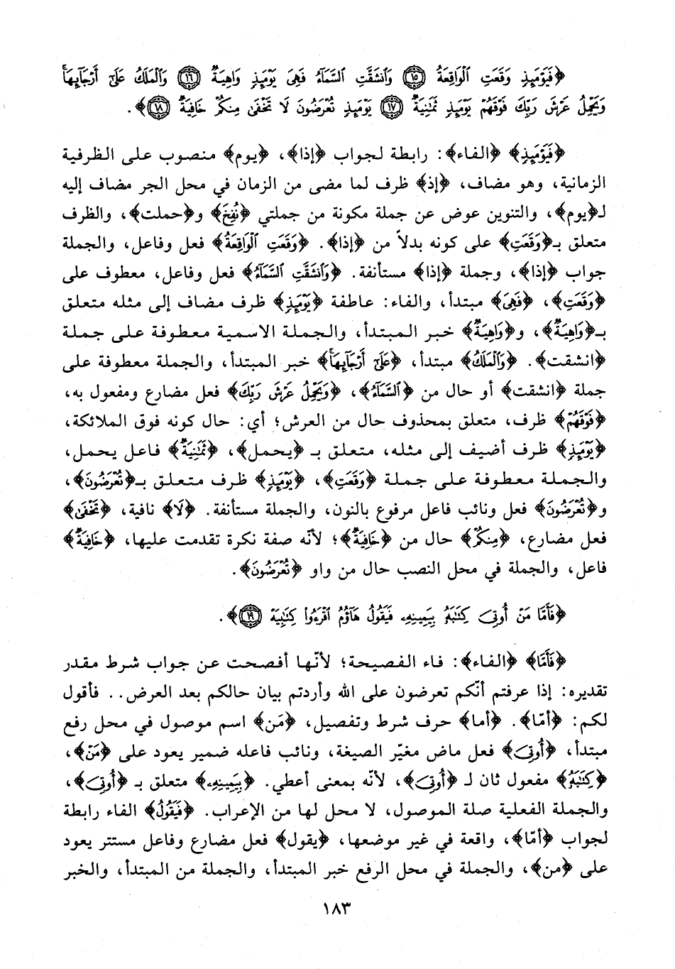 {فَيَوْمَئِذٍ} {الفاء}: رابطة لجواب {إذا}، {يوم} منصوب على الظرفية الزمانية، وهو مضاف، {إذ} ظرف لما مضى من الزمان في محل الجر مضاف إليه لـ {يوم}، والتنوين عوض عن جملة مكونة من جملتي {نُفِخَ} و {حملت}، والظرف متعلق بـ {وَقَعَتِ} على كونه بدلًا من {إذا}. {وَقَعَتِ الْوَاقِعَةُ} فعل وفاعل، والجملة جواب {إذا}، وجملة {إذا} مستأنفة. {وَانْشَقَّتِ السَّمَاءُ} فعل وفاعل، معطوف على {وَقَعَتِ}، {فَهِيَ} مبتدأ، والفاء: عاطفة {يَوْمَئِذٍ} ظرف مضاف إلى مثله متعلق بـ {وَاهِيَةٌ}، و {وَاهِيَةٌ} خبر المبتدأ، والجملة الاسمية معطوفة على جملة {انشقت}. {وَالْمَلَكُ} مبتدأ، {عَلَى أَرْجَائِهَا} خبر المبتدأ، والجملة معطوفة على جملة {انشقت} أو حال من {السَّمَاءُ}، {وَيَحْمِلُ عَرْشَ رَبِّكَ} فعل مضارع ومفعول به، {فَوْقَهُمْ} ظرف، متعلق بمحذوف حال من العرش؛ أي: حال كونه فوق الملائكة، {يَوْمَئِذٍ} ظرف أضيف إلى مثله، متعلق بـ {يحمل}، {ثَمَانِيَةٌ} فاعل يحمل، والجملة معطوفة على جملة {وَقَعَتِ}، {يَوْمَئِذٍ} ظرف متعلق بـ {تُعْرَضُونَ}، و {تُعْرَضُونَ} فعل ونائب فاعل مرفوع بالنون، والجملة مستأنفة. {لَا} نافية، {تَخْفَى} فعل مضارع، {مِنْكُمْ} حال من {خَافِيَةٌ}؛ لأنه صفة نكرة تقدمت عليها، {خَافِيَةٌ} فاعل، والجملة في محل النصب حال من واو {تُعْرَضُونَ}.