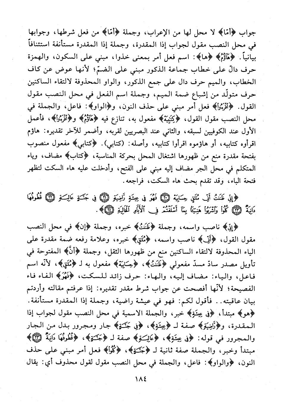 {إِنِّي} ناصب واسمه، وجملة {ظَنَنْتُ} خبره، وجملة {إن} في محل النصب مقول القول، {إِنِّي} ناصب واسمه، {مُلَاقٍ} خبره، وعلامة رفعه ضمة مقدرة على الياء المحذوفة لالتقاء الساكنين منع من ظهورها الثقل، وجملة {أنَّ} المفتوحة في تأويل مصدر سادّ مسدّ مفعولي {ظَنَنْتُ}، {حِسَابِيَهْ} مفعول به لـ {مُلَاقٍ}؛ لأنّه اسم فاعل، والياء: مضاف إليه، والهاء: حرف زائد للسكت، {فَهُوَ} الفاء فاء الفصيحة؛ لأنّها أفصحت عن جواب شرط مقدر تقديره: إذا عرفتم مقالته وأردتم بيان عاقبته .. فأقول لكم: فهو في عيشة راضية، وجملة إذا المقدرة مستأنفة. {هو} مبتدأ، {فِي عِيشَةٍ} خبر، والجملة الاسمية في محل النصب مقول لجواب إذا المقدرة، و {رَاضِيَةٍ} صفة لـ {عِيشَةٍ}، {فِي جَنَّةً} جار ومجرور بدل من الجار والمجرور في قوله: {فِي عِيشَةٍ}، {عَالِيَةٍ} صفة لـ {جَنَّةً}، {قُطُوفُهَا دَانِيَةٌ (23)} مبتدأ وخبر، والجملة صفة ثانية لـ {جَنَّةٍ}، {كُلُوا} فعل أمر مبني على حذف النون، {والواو}: فاعل، والجملة في محل النصب مقول لقول محذوف أي: يقال