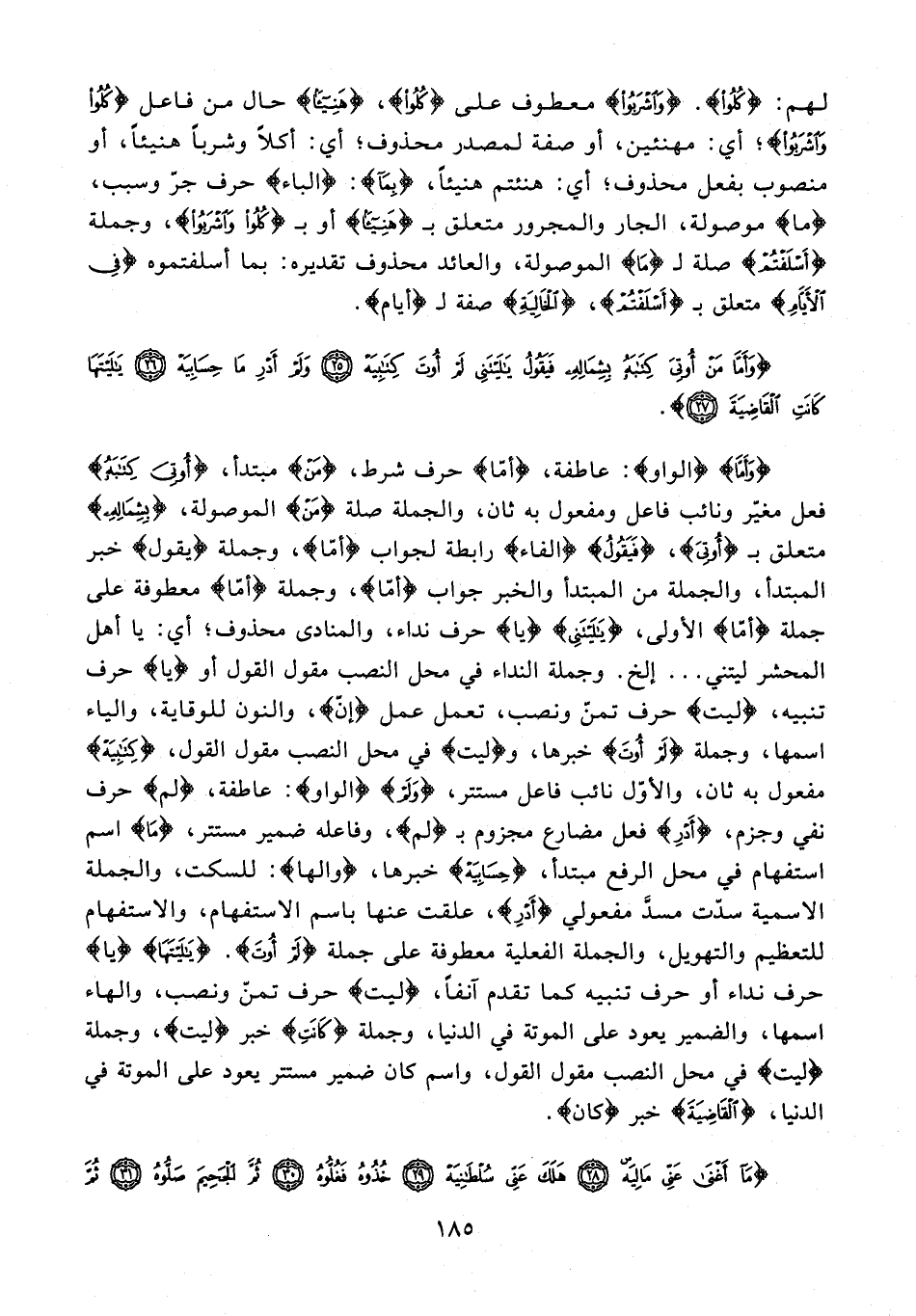 {وَأَمَّا} {الواو}: عاطفة، {أمّا} حرف شرط، {مَنْ} مبتدأ، {أُوتِيَ كِتَابَهُ} فعل مغير ونائب فاعل ومفعول به ثان، والجملة صلة {مَنْ} الموصولة، {بِشِمَالِهِ} متعلق بـ {أُوتِيَ}، {فَيَقُولُ} {الفاء} رابطة لجواب {أمّا}، وجملة {يقول} خبر المبتدأ، والجملة من المبتدأ والخبر جواب {أمّا}، وجملة {أمّا} معطوفة على جملة {أمّا} الأولى، {يَا لَيْتَنِي} {يا} حرف نداء، والمنادى محذوف؛ أي: يا أهل المحشر ليتني ... إلخ. وجملة النداء في محل النصب مقول القول أو {يا} حرف تنبيه، {ليت} حرف تمنّ ونصب، تعمل عمل {إن}، والنون للوقاية، والياء اسمها، وجملة {لَمْ أُوتَ} خبرها، و {ليت} في محل النصب مقول القول، {كِتَابِيَهْ} مفعول به ثان، والأول نائب فاعل مستتر، {وَلَمْ} {الواو}: عاطفة، {لم} حرف نفي وجزم، {أَدْرِ} فعل مضارع مجزوم بـ {لم}، وفاعله ضمير مستتر، {مَا} اسم استفهام في محل الرفع مبتدأ، {حِسَابِيَهْ} خبرها، {والها}: للسكت، والجملة الاسمية سدّت مسدَّ مفعولي {أَدْرِ}، علقت عنها باسم الاستفهام، والاستفهام للتعظيم والتهويل، والجملة الفعلية معطوفة على جملة {لم أُوتَ}. {يَا لَيْتَهَا} {يا} حرف نداء أو حرف تنبيه كما تقدم آنفًا، {ليت} حرف تمنّ ونصب، والهاء اسمها، والضمير يعود على الموتة في الدنيا، وجملة {كَانَتِ} خبر {ليت}، وجملة {ليت} في محل النصب مقول القول، واسم كان ضمير مستتر يعود على الموتة في الدنيا، {الْقَاضِيَةَ} خبر {كان}.