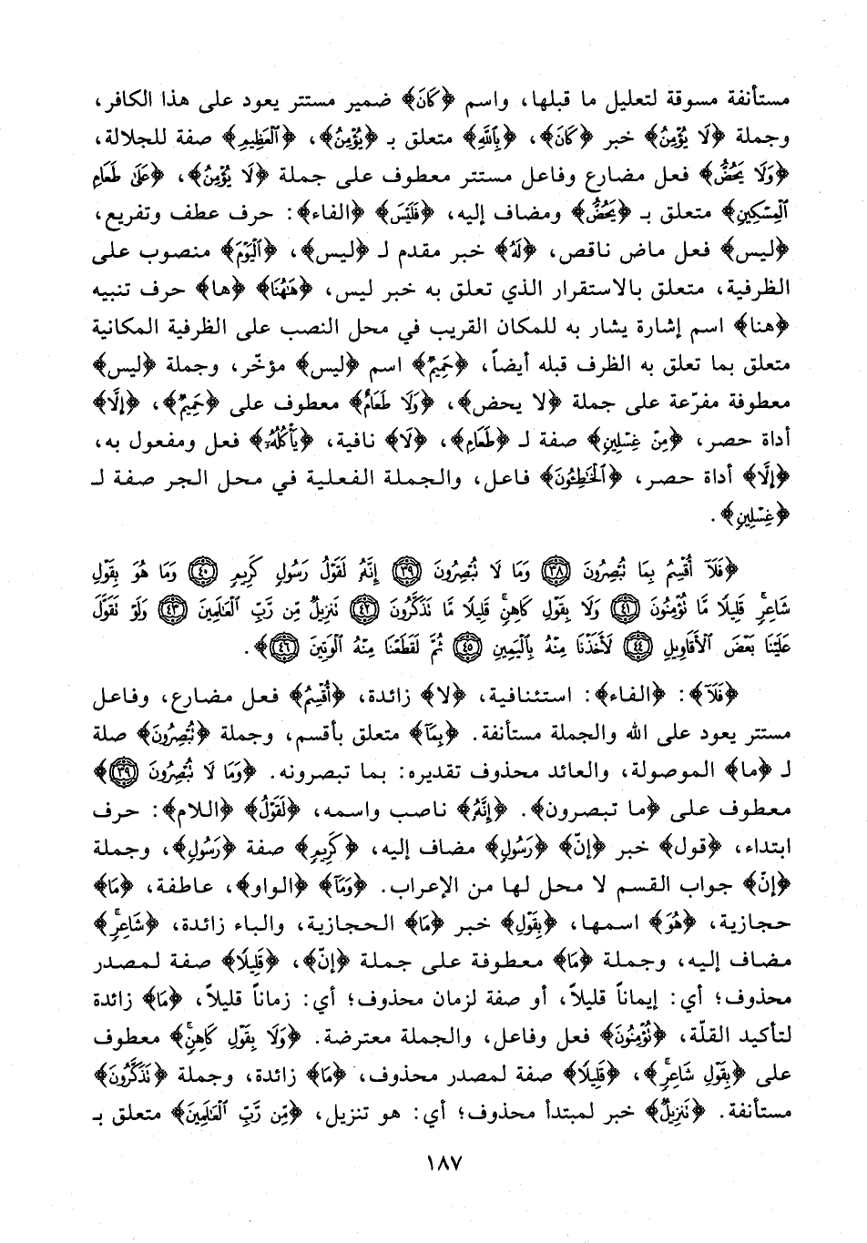 {فَلَا}: {الفاء}: استئنافية، {لا} زائدة، {أُقْسِمُ} فعل مضارع، وفاعل مستتر يعود على الله والجملة مستأنفة. {بمَا} متعلق بأقسم، وجملة {تُبْصِرُونَ} صلة لـ {ما} الموصولة، والعائد محذوف تقديره: بما تبصرونه. {وَمَا لَا تُبْصِرُونَ (39)} معطوف على {مَا تُبْصِرُونَ}. {إِنَّهُ} ناصب واسمه، {لَقَوْلُ} {اللام}: حرف ابتداء، {قول} خبر {إنّ} {رَسُولٍ} مضاف إليه، {كَرِيمٍ} صفة {رَسُولٍ}، وجملة {إنّ} جواب القسم لا محل لها من الإعراب. {وَمَا} {الواو}، عاطفة، {مَا} حجازية، {هُوَ} اسمها، {بِقَوْلِ} خبر {مَا} الحجازية، والباء زائدة، {شَاعِرٍ} مضاف إليه، وجملة {مَا} معطوفة على جملة {إنّ}، {قَلِيلًا} صفة لمصدر محذوف؛ أي: إيمانًا قليلًا، أو صفة لزمان محذوف؛ أي: زمانًا قليلًا، {مَا} زائدة لتأكيد القلّة، {تُؤْمِنُونَ} فعل وفاعل، والجملة معترضة. {وَلَا بِقَوْلِ كَاهِنٍ} معطوف على {بِقَوْلِ شَاعِرٍ}، {قَلِيلًا} صفة لمصدر محذوف، {مَا} زائدة، وجملة {تَذَكَّرُونَ} مستأنفة. {تَنْزِيلٌ} خبر لمبتدأ محذوف؛ أي: هو تنزيل، {مِنْ رَبِّ الْعَالَمِينَ} متعلق بـ