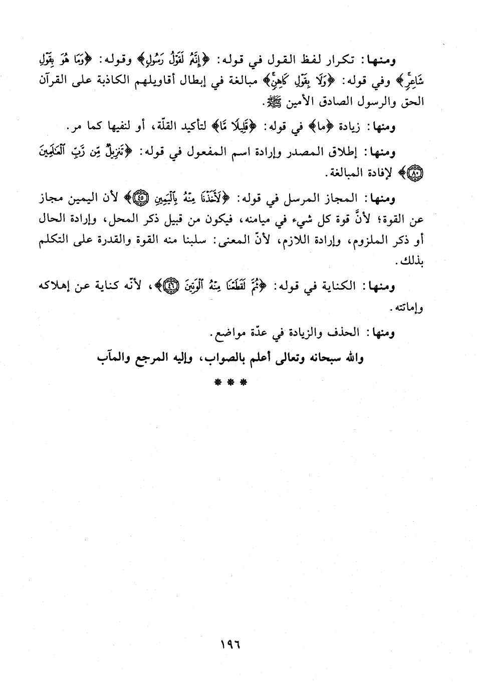 ومنها: تكرار لفظ القول في قوله: {إِنَّهُ لَقَوْلُ رَسُولٍ} وقوله: {وَمَا هُوَ بِقَوْلِ شَاعِرٍ} وفي قوله: {وَلَا بِقَوْلِ كَاهِنٍ} مبالغة في إبطال أقاويلهم الكاذبة على القرآن الحق والرسول الصادق الأمين - صلى الله عليه وسلم -.