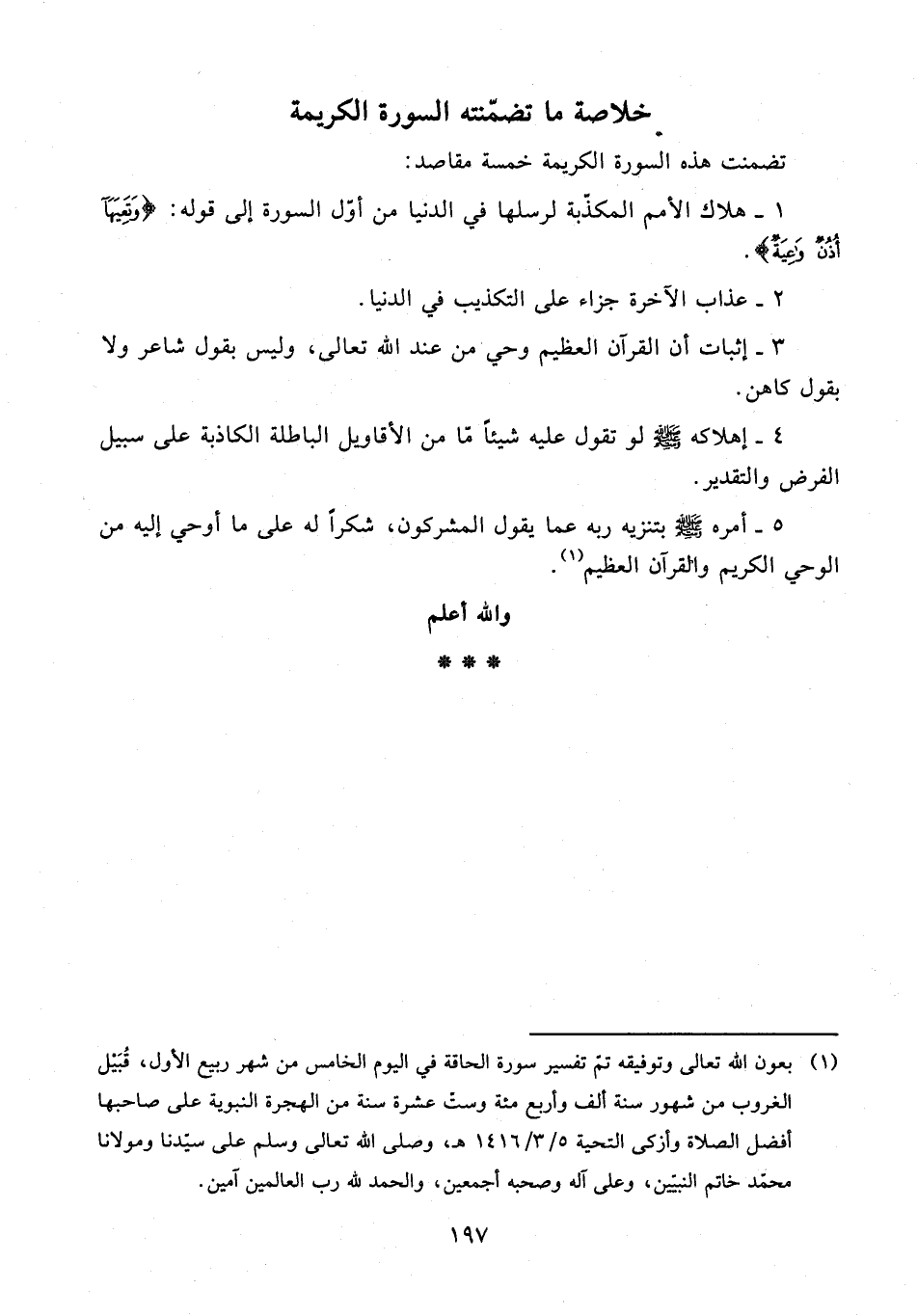 (¬1) بعون الله تعالى وتوفيقه تمّ تفسير سورة الحاقة في اليوم الخامس من شهر ربيع الأول، قُبَيْل الغروب من شهور سنة ألف وأربع مئة وستّ عشرة سنة من الهجرة النبوية على صاحبها أفضل الصلاة وأزكى التحية 5/ 3/ 1416 هـ، وصلى الله تعالى وسلم على سيّدنا ومولانا محمد خاتم النبيين، وعلى آله وصحبه أجمعين، والحمد لله رب العالمين آمين.
